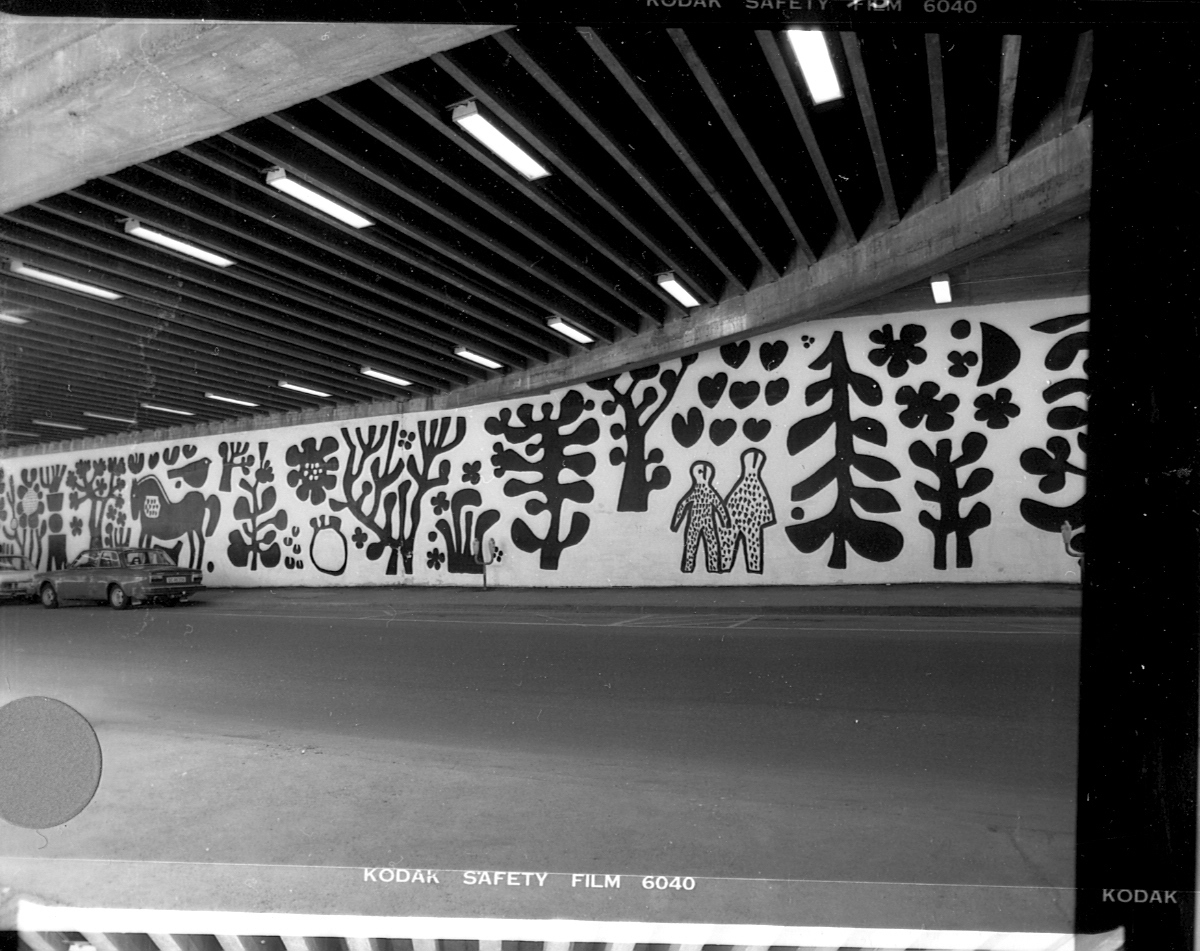 Når den i lang tid blokkerte gjennomfartsåren fra Youngstorget til Akersgata nå åpner, vil man dermed kunne kikke inn på for eksempel Elise Storsveens vevearbeid Kys mik. Verket består av lange bånd dekorert med motiver basert på tegn fra ulike alfabeter, piktogrammer og symbolkulturer. Noen ord er gjenkjennelige som eksklamasjoner eller imperativer, andre mer abstrakte, og andre igjen er symboler fra ulike kulturer som skal holde onde krefter borte.