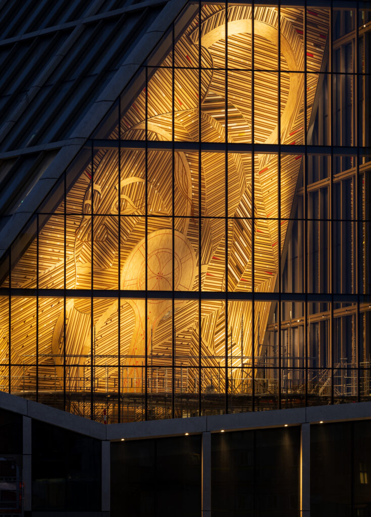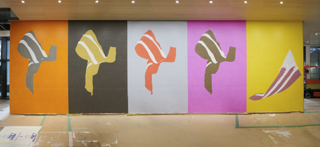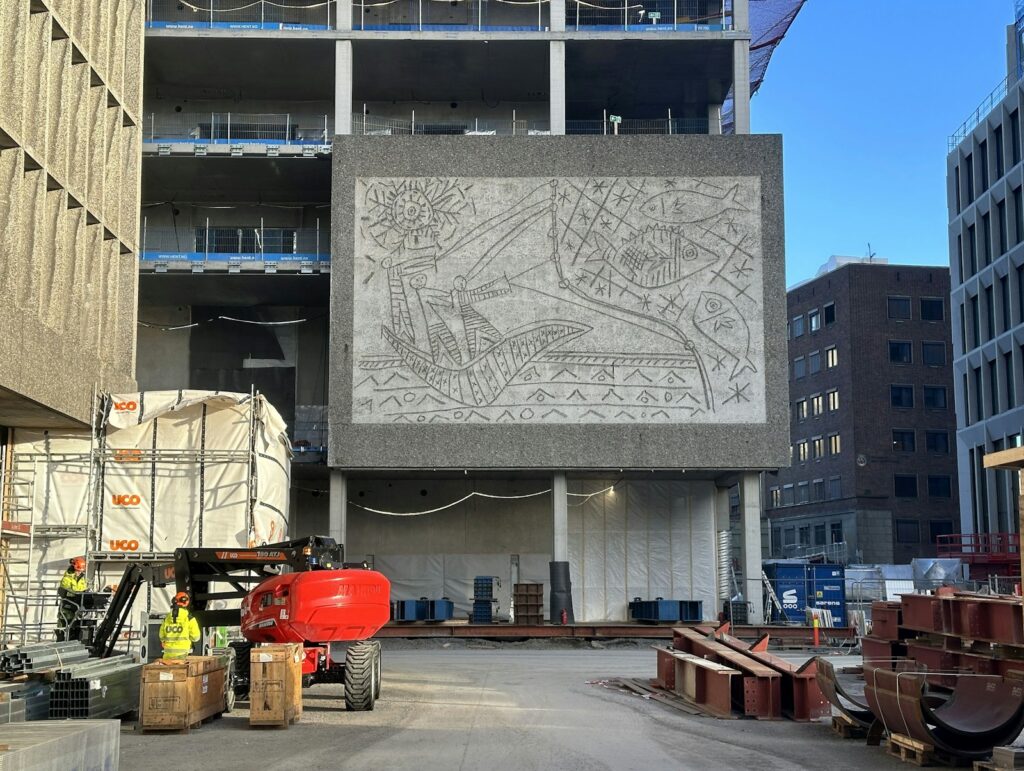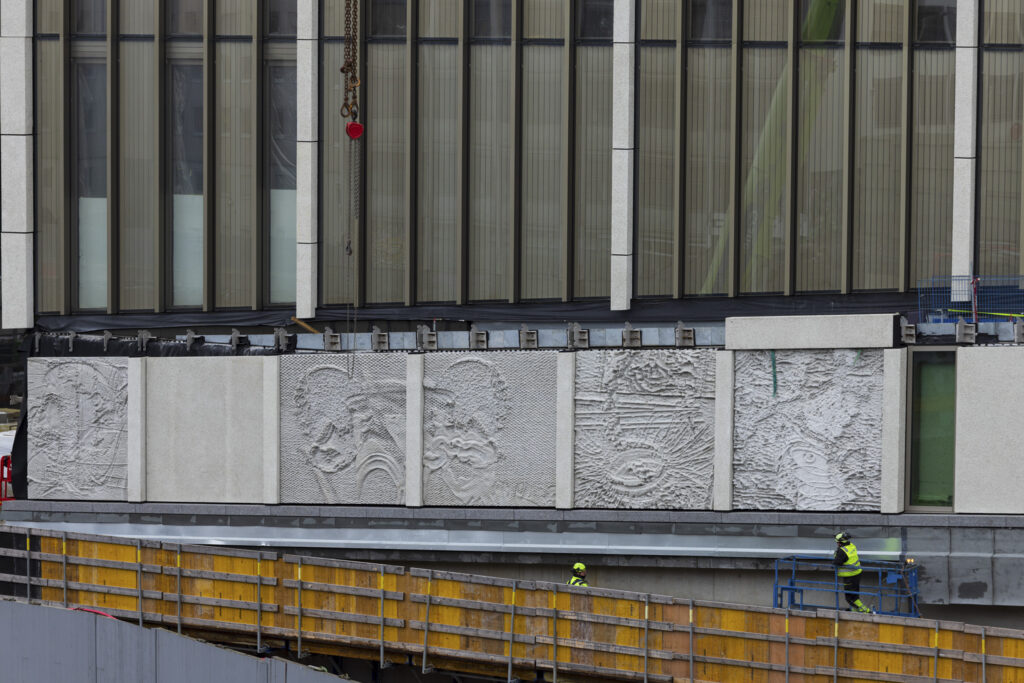 Damla Kilickirans nye veggarbeid Sites of a Breach, Delays in a Dream; A Surface Half Asleep er montert i sokkelen av A-blokka ut mot Grubbegata og mot gamle Deichmanske bibliotek. Foto: Trond Isaksen / KORO.