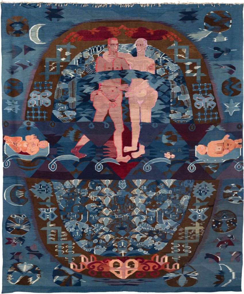 Samtidig er denne synligheten en insisterende påminner om fortellinger og observasjonspunkter som har vært aktivt undertrykt i den norske nasjonsdannelsen. Gjenkjennelig på kvinnens hode er for eksempel det nordsamiske hodeplagget ládjogahpir – den karakteristiske hornluen som ble forbudt av læstadianerne på 1850-tallet, og i hånden holder hun en stav med mønstre og ornamenter fra sørsamiske duodji-tradisjoner. Referansen til de samiske kvinnene som i 1981 okkuperte statsministerens kontor under Alta-opprøret er åpenbar, men ikke overtydelig. Tittelen AAhkA, som kan henvise til en gruppe kvinnelige samiske guder og til et utbredt navn på hellige fjell, gjør dessuten at figuren peker både bakover og fremover i tid. Det vitner om Pieskis inspirasjon i det hun selv beskriver med referanse til urfolksfuturismens økobevissthet – der det hellige uttrykker en respekt for naturressursenes hårfine balanse – og den stadig mer etablerte erkjennelsen av at avkolonisering er vår alles kamp. Forbindelsen mellom tradisjoner og økologi går igjen i Hilde Skancke Pedersens tekstilarbeid Bassi várri, giđđadálvi – Hellig fjell, vårvinter, som skal monteres i D-blokka. Her danner gjenbrukte tekstiler portrettet av et fjell på den norske siden av Sápmi, hvor fremtidshåpet forankres i et vinterlandskap som går mot en gryende vår. I Pieskis veggarbeid danner utskårede og fargede triangler (og tittelen AAhkA) ekko av rommets trekantform, og gir et finurlig spill med skala som plasserer kvinnen både innenfor og utenfor arkitekturens former.
