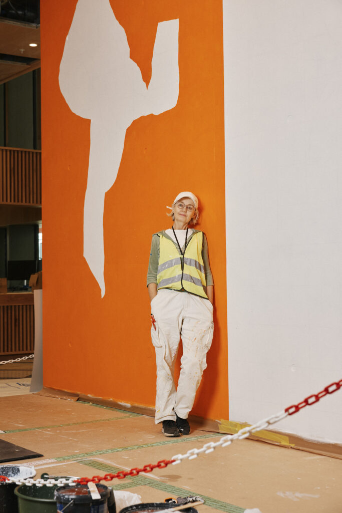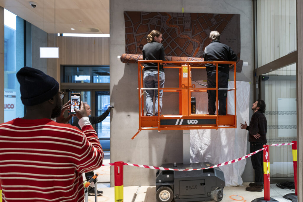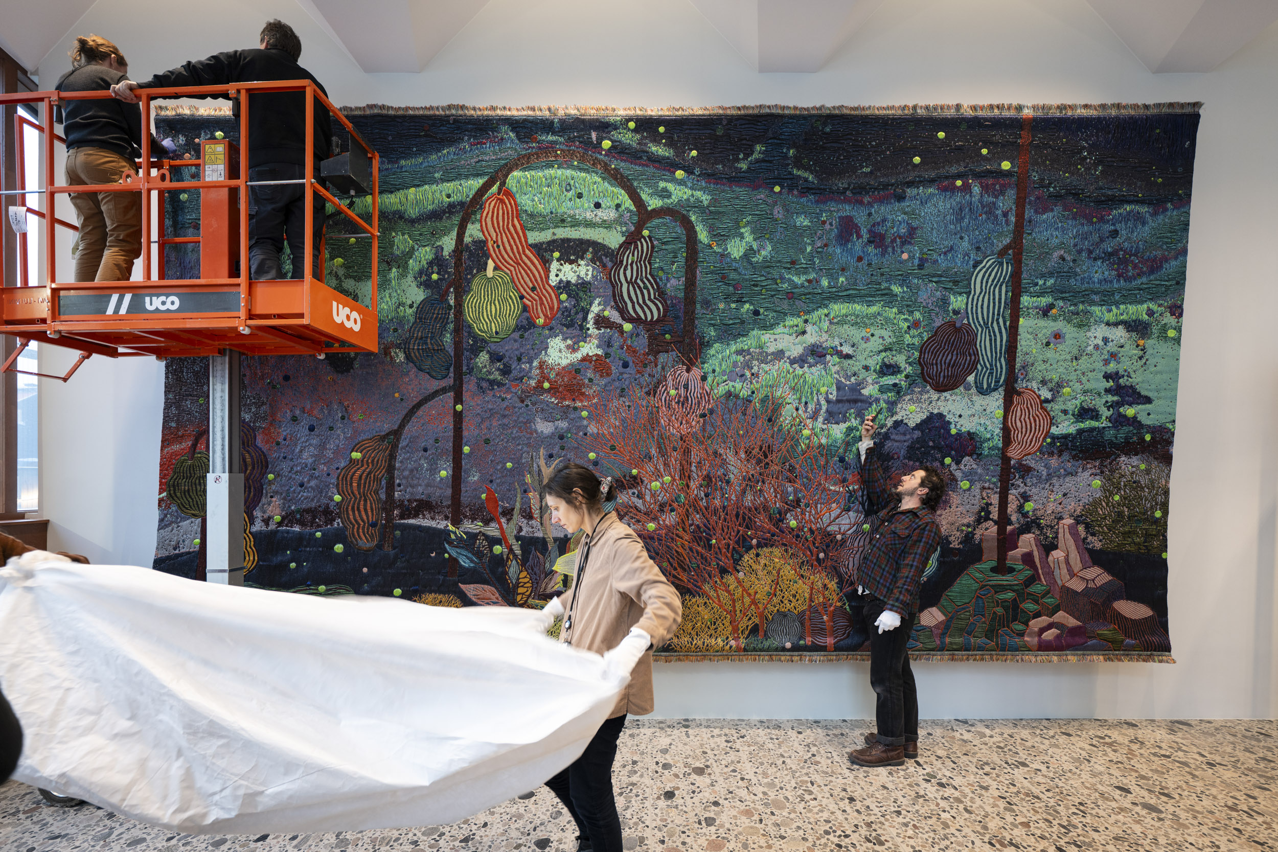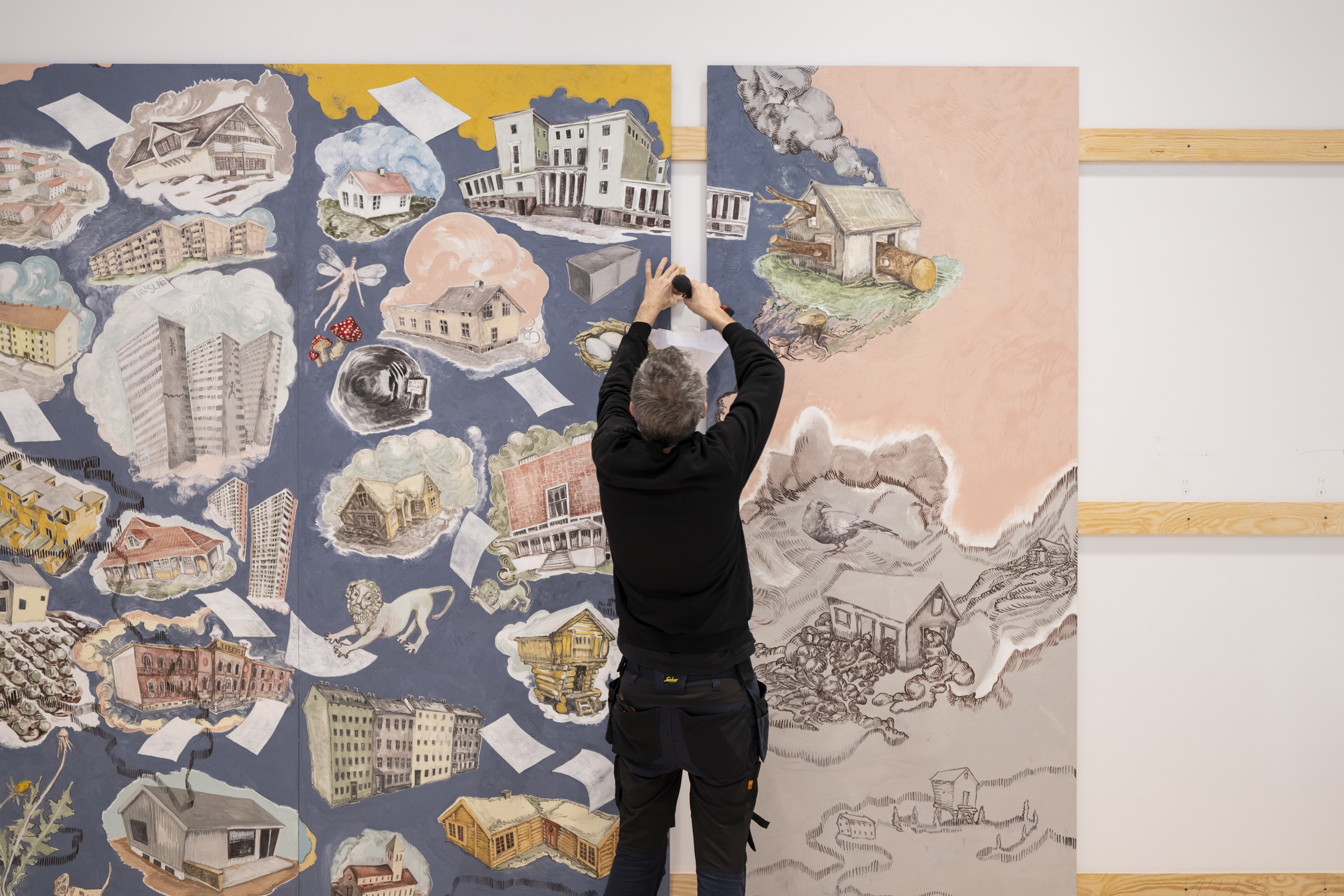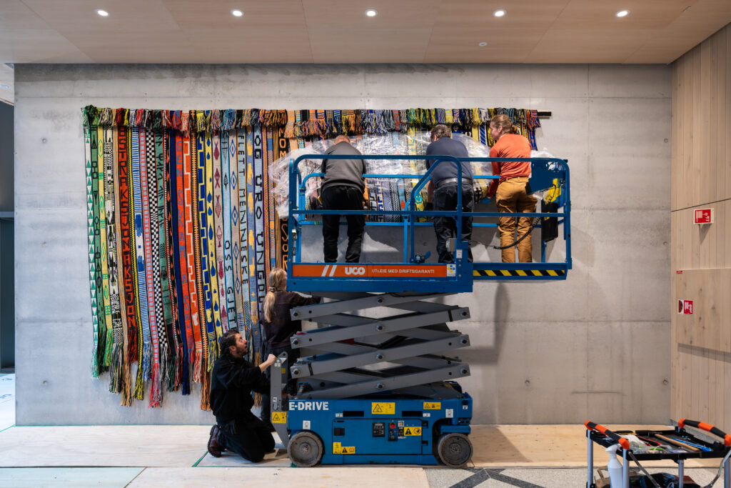 Kunstnere, kunstteknikere, kuratorer, konservatorer og KOROs øvrige prosjektteam har alle bidratt i monteringsprosessen. Foto: Christian Tunge / KORO. Outi Pieski legger siste hånd på vandrestavene til "AAhkA". Foto: Christian Tunge / KORO. Mari Slaattelid malte direkte på en massiv betongvegg, høsten 2025. Foto: Jan Khür – Abrakadabra Studio / KORO. Mari Slaattelid foran betongveggen i D-blokkas personalinngang, høsten 2025. Foto: Jan Khür – Abrakadabra Studio / KORO. Det tok flere dager å få Vanessa Bairds tre store malerier på plass. Foto: Niklas Hart / KORO. Siste finpuss: Malerikonservator klargjør Vanessa Bairds maleri før montering. Foto: Niklas Hart / KORO. Arbeidet med å montere Hannah Ryggens "Vi lever på en stjerne" var en møysommelig prosess. Foto: Niklas Hart / KORO. Tekstilkonservator undersøker Hannah Ryggens "Vi lever på en stjerne" etter at verket var montert. Foto: Niklas Hart / KORO.