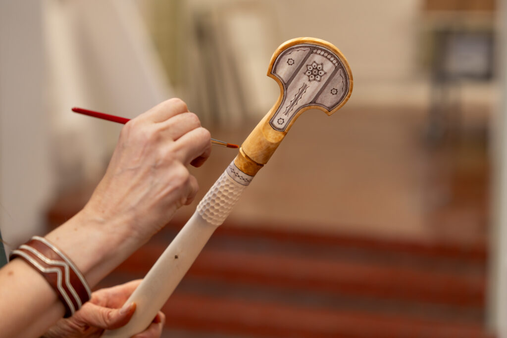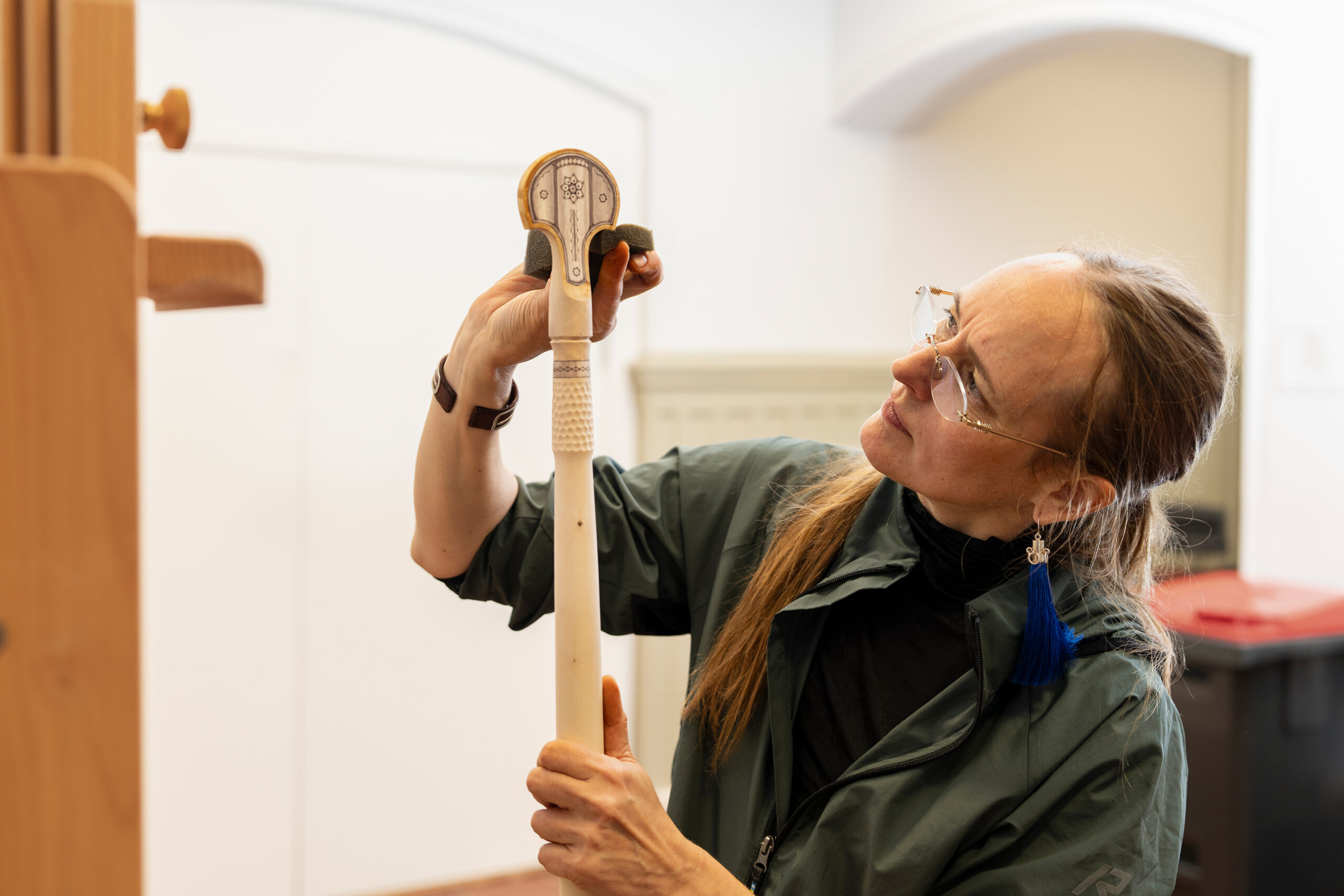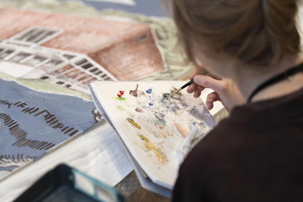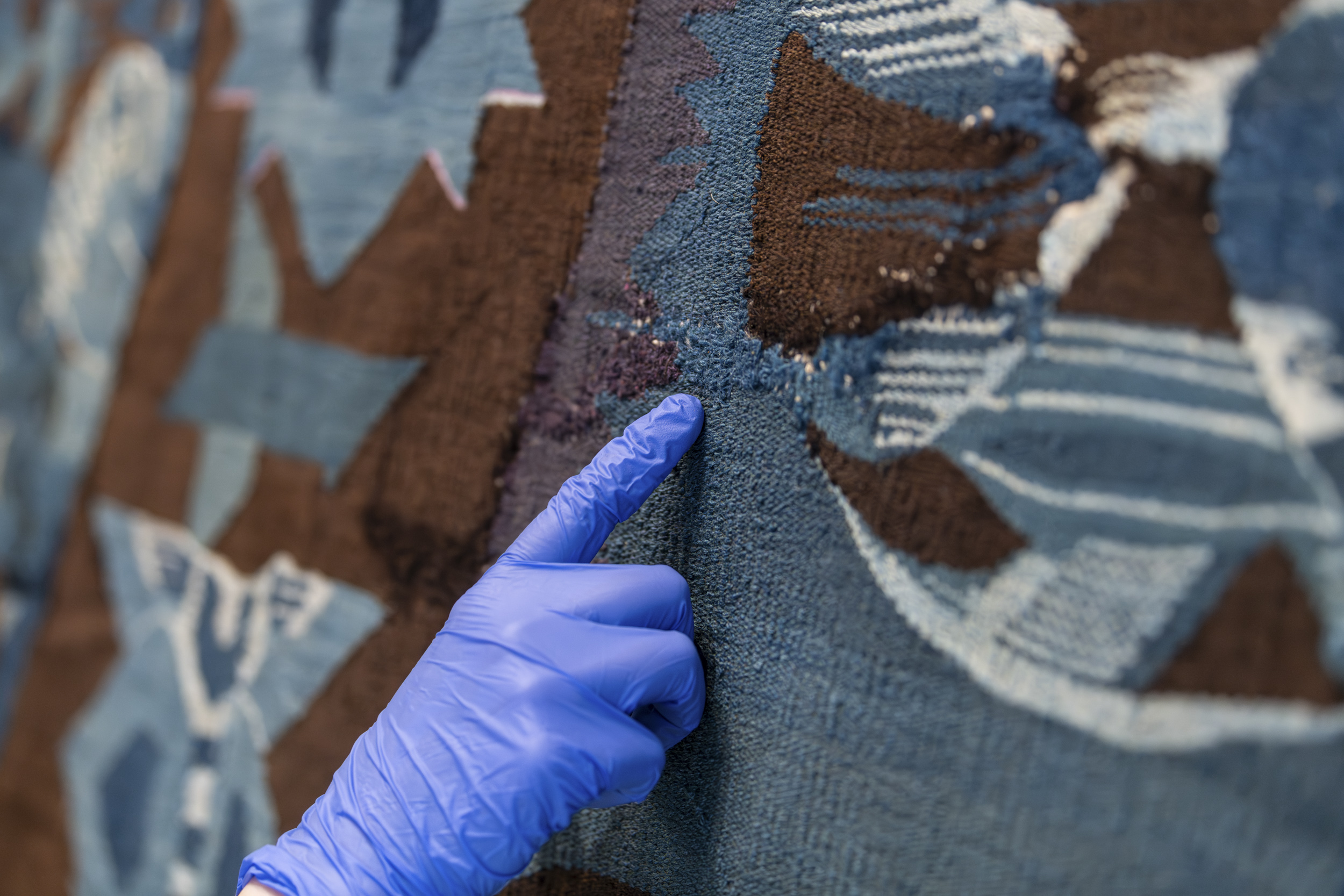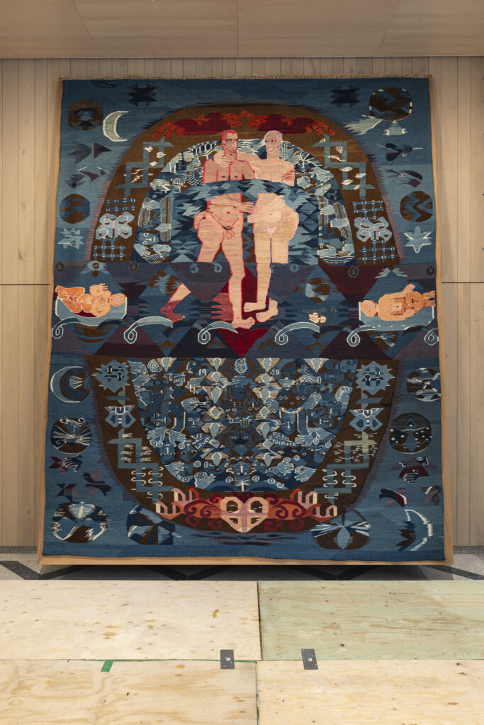 Kunstnere, kunstteknikere, kuratorer, konservatorer og KOROs øvrige prosjektteam har alle bidratt i monteringsprosessen. Foto: Christian Tunge / KORO. Outi Pieski legger siste hånd på vandrestavene til "AAhkA". Foto: Christian Tunge / KORO. Mari Slaattelid malte direkte på en massiv betongvegg, høsten 2025. Foto: Jan Khür – Abrakadabra Studio / KORO. Mari Slaattelid foran betongveggen i D-blokkas personalinngang, høsten 2025. Foto: Jan Khür – Abrakadabra Studio / KORO. Det tok flere dager å få Vanessa Bairds tre store malerier på plass. Foto: Niklas Hart / KORO. Siste finpuss: Malerikonservator klargjør Vanessa Bairds maleri før montering. Foto: Niklas Hart / KORO. Arbeidet med å montere Hannah Ryggens "Vi lever på en stjerne" var en møysommelig prosess. Foto: Niklas Hart / KORO. Tekstilkonservator undersøker Hannah Ryggens "Vi lever på en stjerne" etter at verket var montert. Foto: Niklas Hart / KORO.