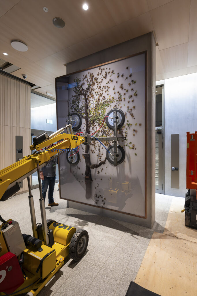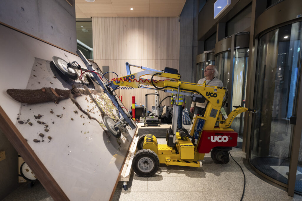 Arbeidet med kunsten til det nye regjeringskvartalet er inne i en travel fase. I løpet av våren vil KORO ha montert og installert over 300 kunstverk. Monteringen omfatter alt fra store integrerte installasjoner til mindre verk i kontorer, møterom og fellesarealer, og krever grundig planlegging, velkoordinert logistikk og høy teknisk kompetanse.