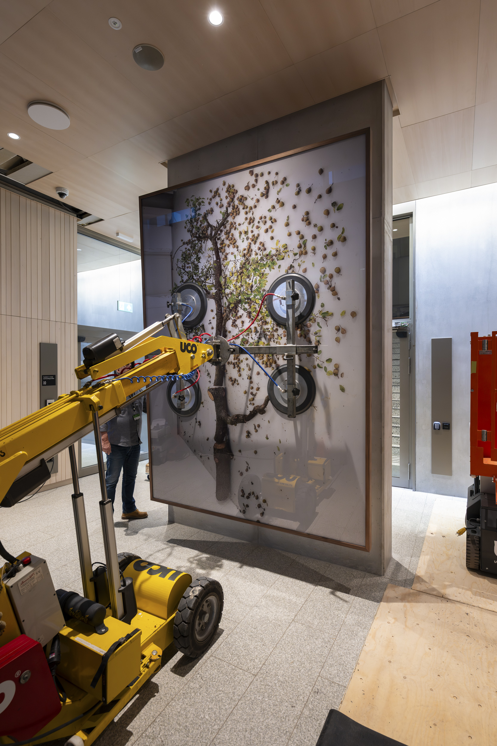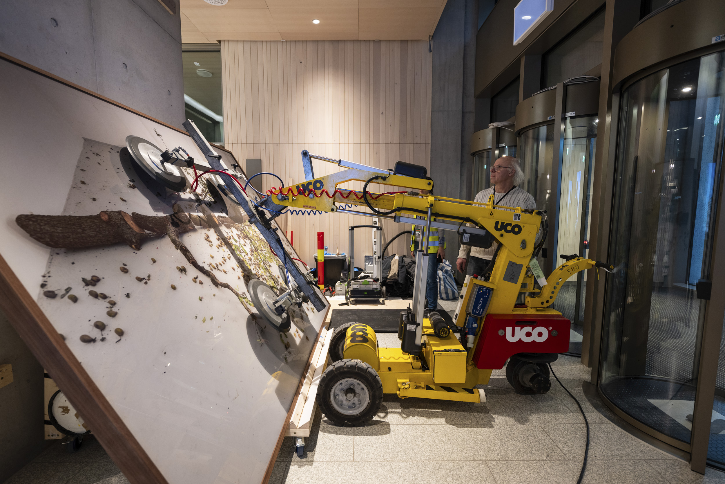 1: Sakselifter, lastebilkran, gravemaskin og vakuumløfter har vært flittig brukt gjennom hele monteringsprosessen. Foto: Niklas Hart / KORO. 2: Oppe i sakseliften inspiserer Damla Kilickiran de ti relieffene hun har laget for A-blokka, januar 2025. Foto: Trond Isaksen / KORO. 3: Otobong Nkangas tekstilarbeid i Høyblokkas paviljonginngang. Foto: Niklas Hart / KORO. 4: Et skulpturelement fra Otobong Nkangas kunstverk løftes inn i paviljongen. Foto: Niklas Hart / KORO. 5: Tre massive steiner ble løftet inn i Høyblokkas østre paviljong ved hjelp av en lastebilkran. Foto: Niklas Hart / KORO. 6: Nitidig manøvrering. Foto: Niklas Hart / KORO. 7: Jumana Mannas bygulv "Sebastia" sett fra Høyblokka rett før ferdigstillelse, høsten 2025. Foto: Niklas Hart / KORO. 8: "Avkastning" av Else Marie Hagen heises på plass av en vakuumløfter. Foto: Niklas Hart / KORO. 9: Det store fotografiet løftes på plass. Foto: Niklas Hart / KORO. 10: Kunstner Else Marie Hagen under monteringen. Foto: Niklas Hart / KORO. 11: Else Marie Hagens fotografi "Avkastning" monteres i A-blokkas personalinngang. Foto: Niklas Hart / KORO. 12: Kunstner Damien Ajavon dokumenterer monteringsprosessen. Foto: Niklas Hart / KORO. 13: Kurator, konservator og kunstner tar en pust i bakken. Foto: Niklas Hart / KORO.