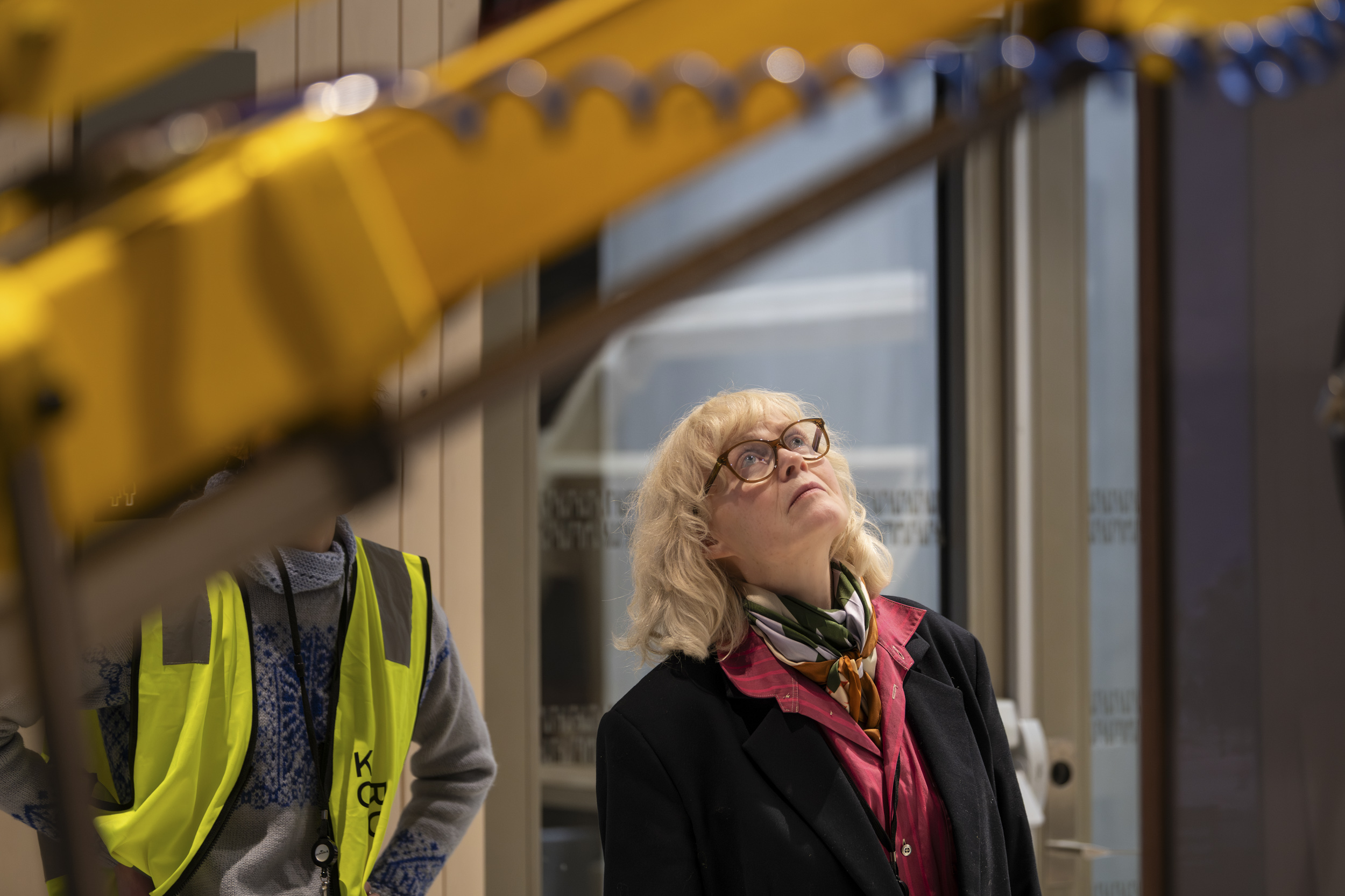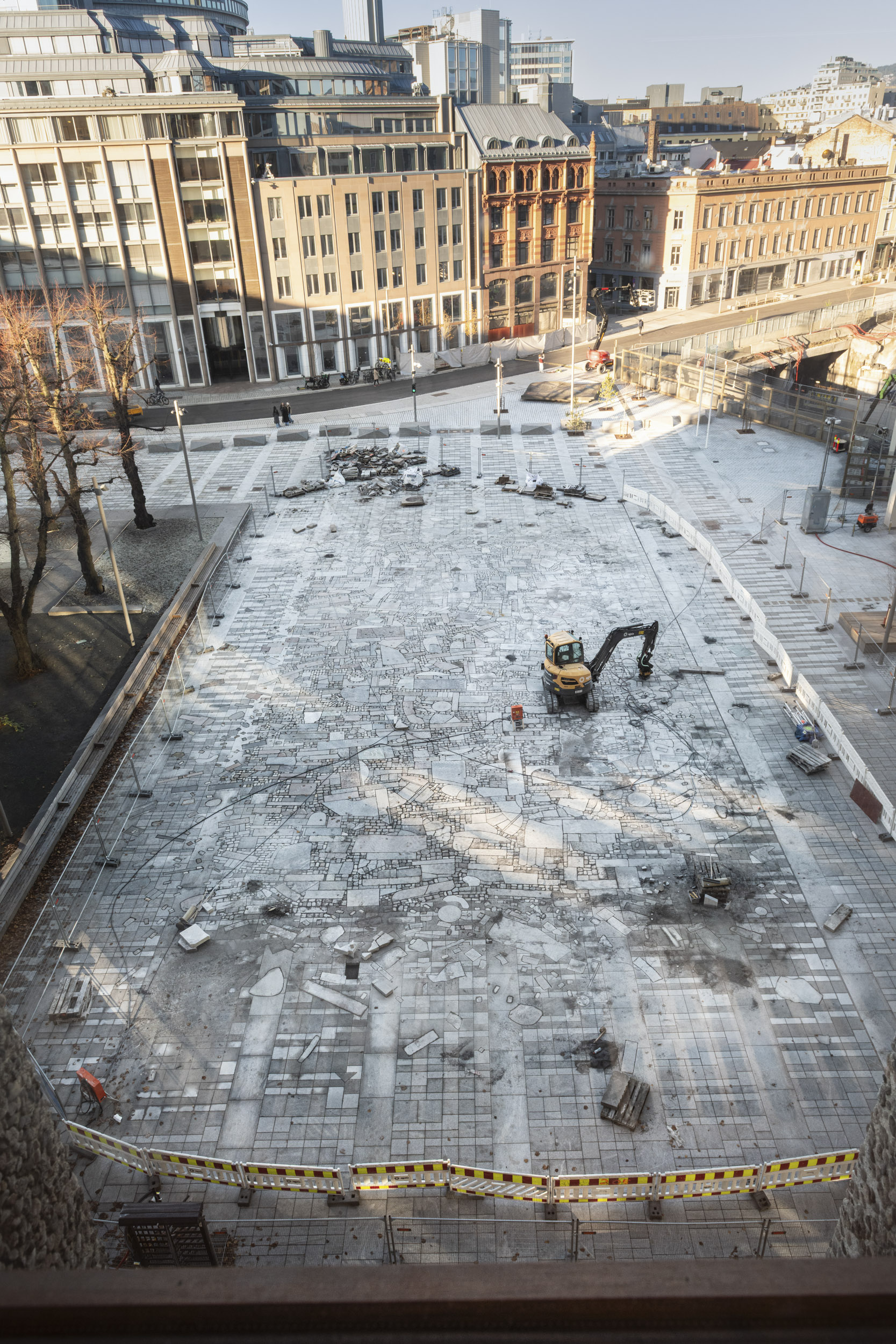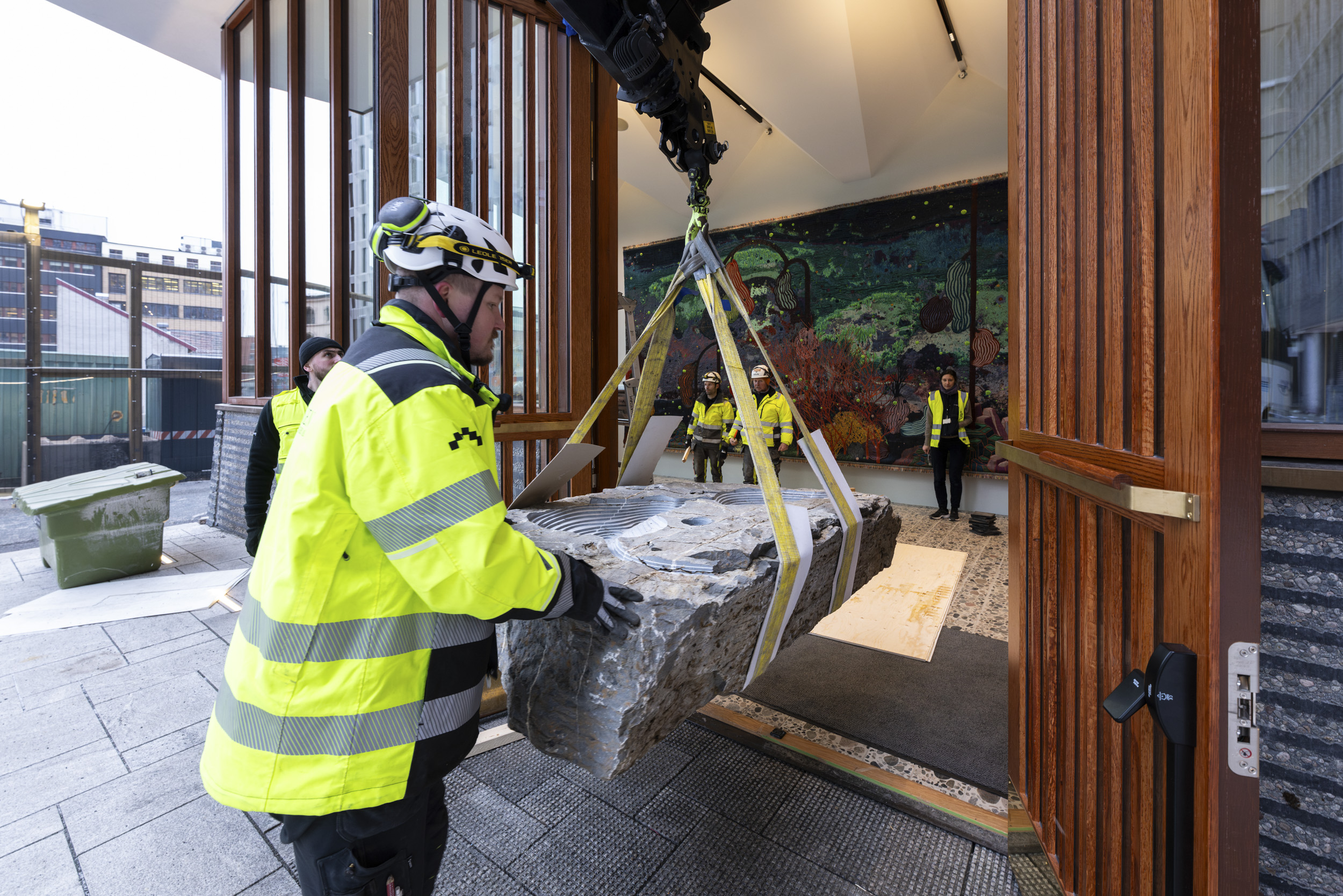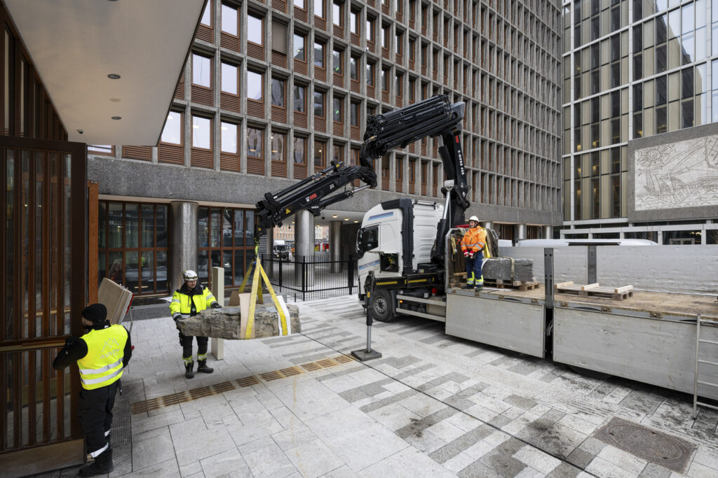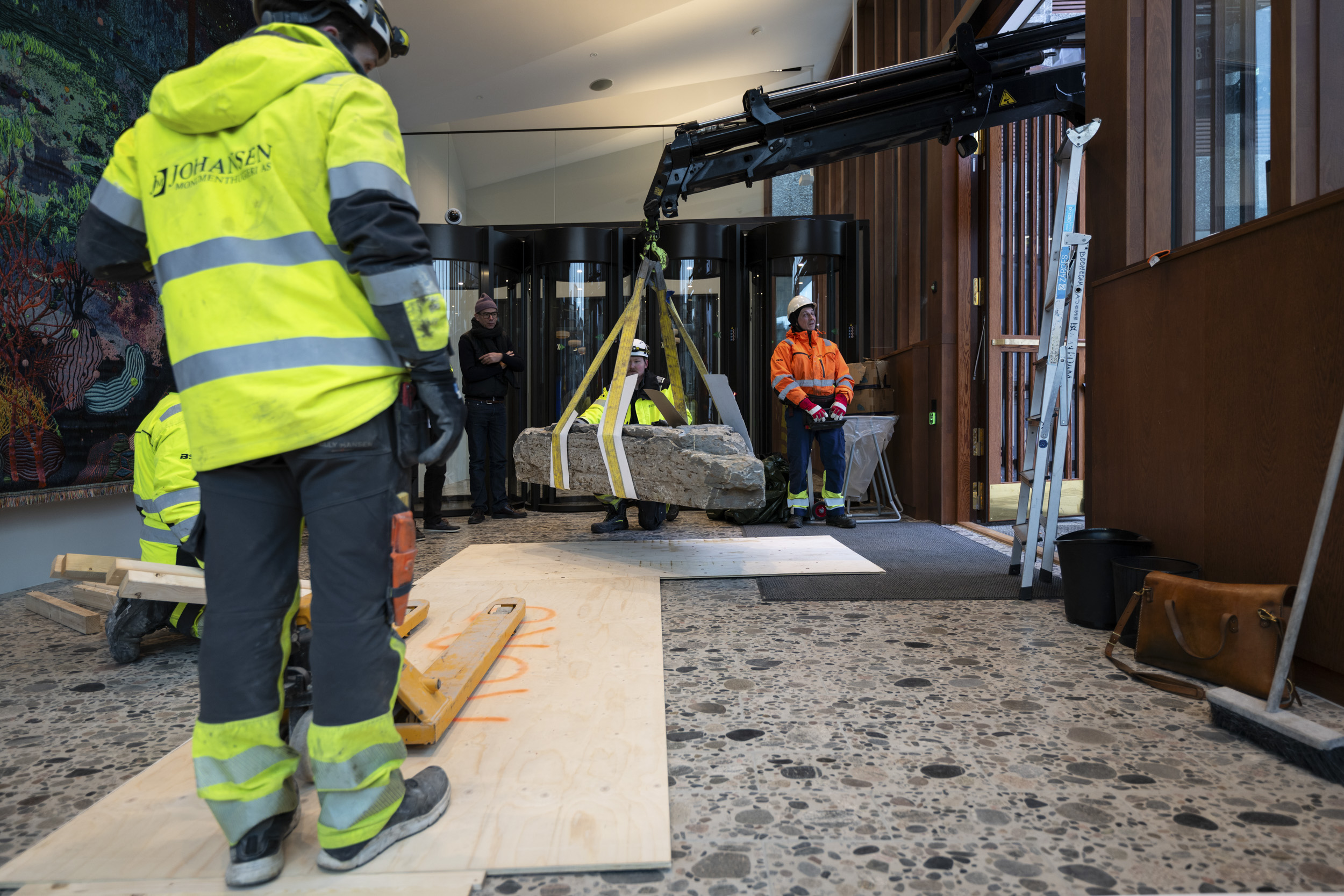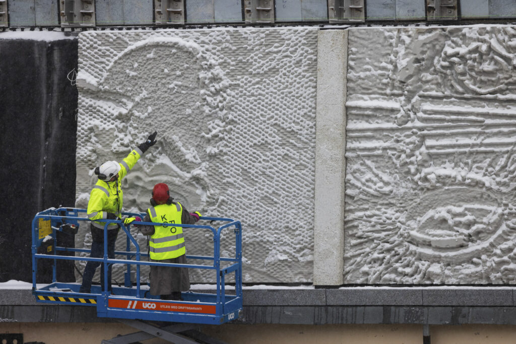 Sakselifter, lastebilkran, gravemaskin og vakuumløfter har vært flittig brukt gjennom hele monteringsprosessen. Foto: Niklas Hart / KORO. Oppe i sakseliften inspiserer Damla Kilickiran de ti relieffene hun har laget for A-blokka, januar 2025. Foto: Trond Isaksen / KORO. Otobong Nkangas tekstilarbeid i Høyblokkas paviljonginngang. Foto: Niklas Hart / KORO. Et skulpturelement fra Otobong Nkangas kunstverk løftes inn i paviljongen. Foto: Niklas Hart / KORO. Tre massive steiner ble løftet inn i Høyblokkas østre paviljong ved hjelp av en lastebilkran. Foto: Niklas Hart / KORO. Nitidig manøvrering. Foto: Niklas Hart / KORO. Jumana Mannas bygulv "Sebastia" sett fra Høyblokka rett før ferdigstillelse, høsten 2025. Foto: Niklas Hart / KORO. "Avkastning" av Else Marie Hagen heises på plass av en vakuumløfter. Foto: Niklas Hart / KORO. Det store fotografiet løftes på plass. Foto: Niklas Hart / KORO. Kunstner Else Marie Hagen under monteringen. Foto: Niklas Hart / KORO. Else Marie Hagens fotografi "Avkastning" monteres i A-blokkas personalinngang. Foto: Niklas Hart / KORO. Kunstner Damien Ajavon dokumenterer monteringsprosessen. Foto: Niklas Hart / KORO. Kurator, konservator og kunstner tar en pust i bakken. Foto: Niklas Hart / KORO.