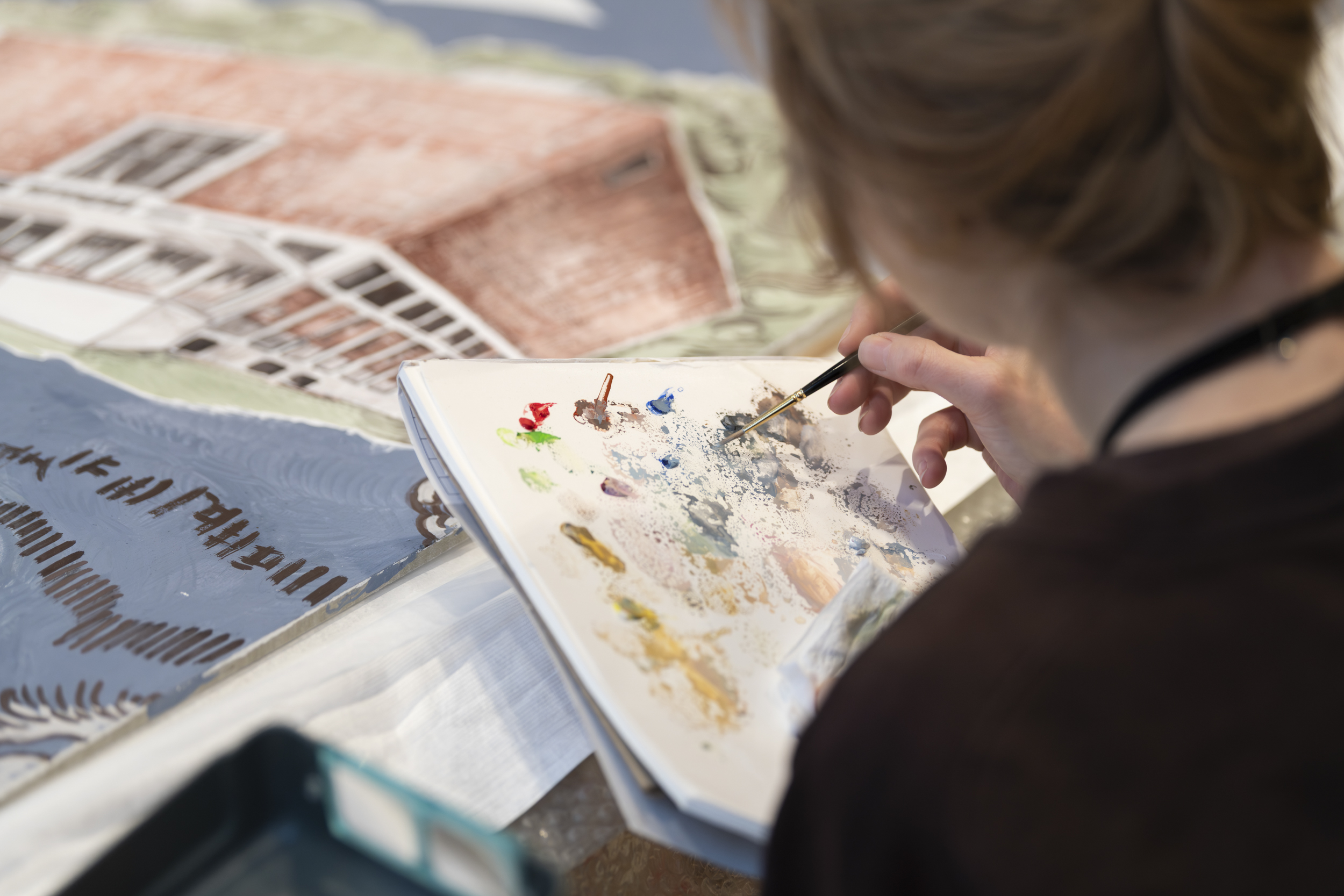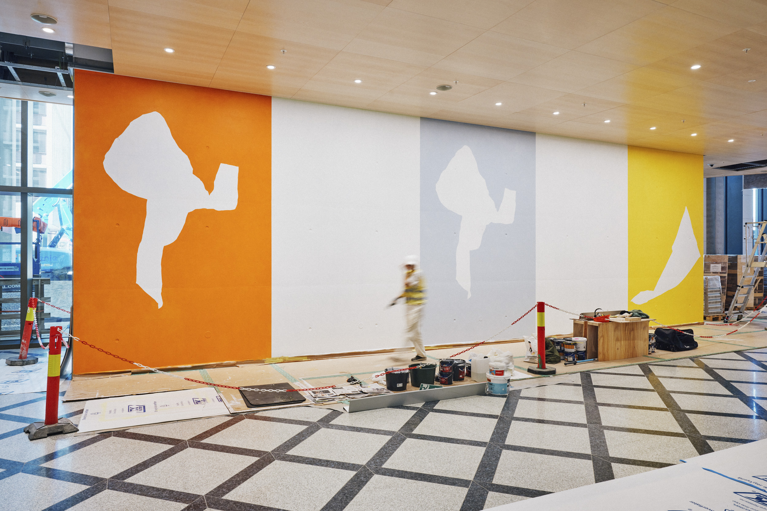 Kunstteknikere og malerikonservator jobbet side om side under installeringen av Vanessa Bairds malerier i A-blokkas kafé 1814. Foto: Niklas Hart / KORO.