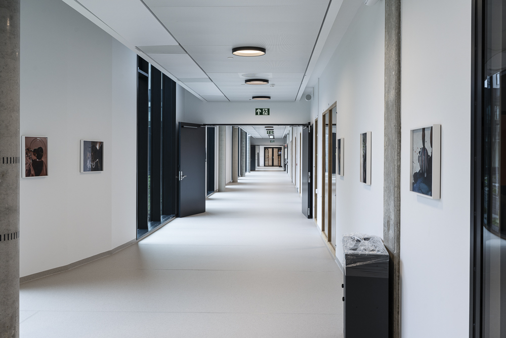 I atriet bak prosjektdirektøren skimtes Herman Mbambas (f. 1980) 15 meter lange veggmaleri – en vital miks av former og farger, synlig fra alle vindusflatene som omkranser uteområdet oppover i bygget. Ved resepsjonen er hvite former montert i buet rytme nedover en betongvegg, en del av Cory Arcangels (f. 1978) verk.