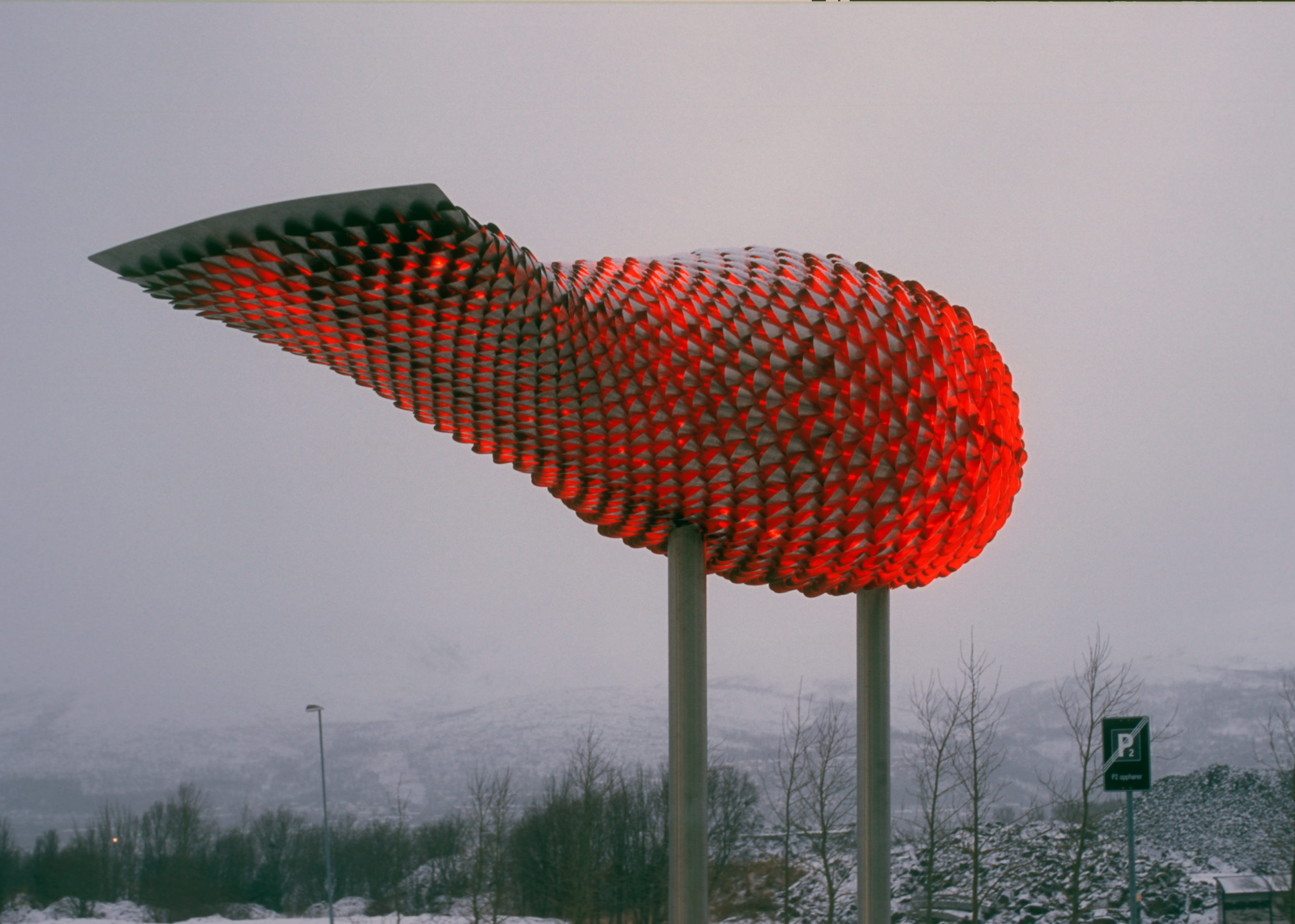 Formbøying, Lysinstallasjon, Metall, Perforering, Skulptur, Sveising, Uterom, Valsing