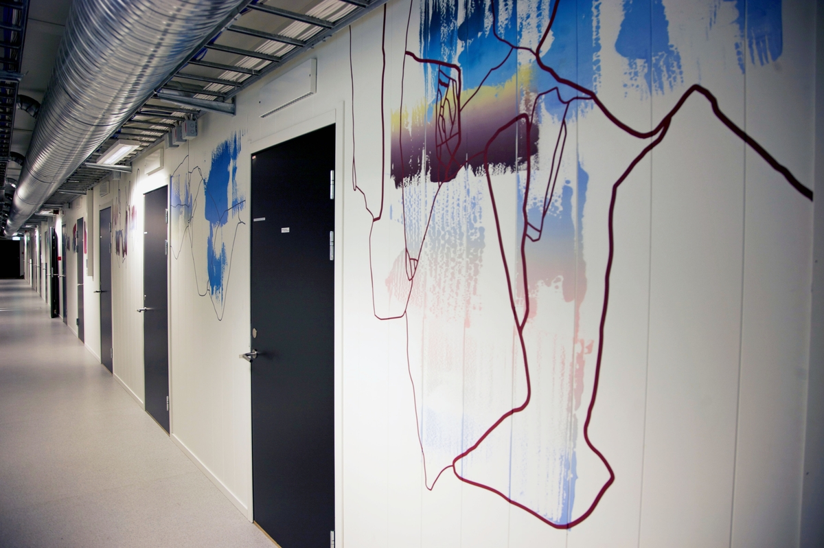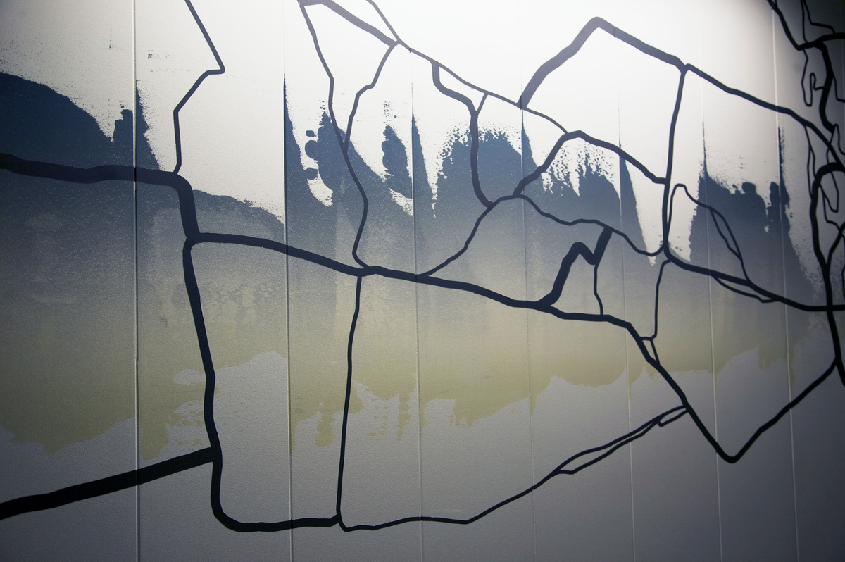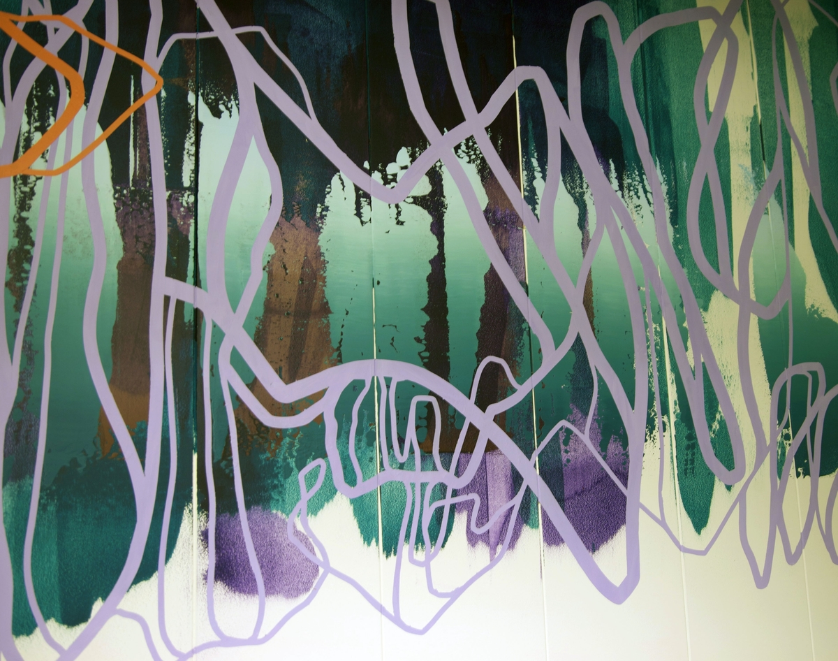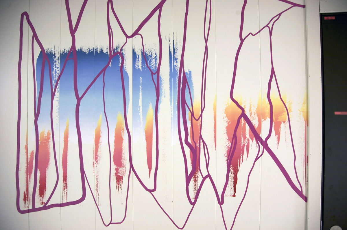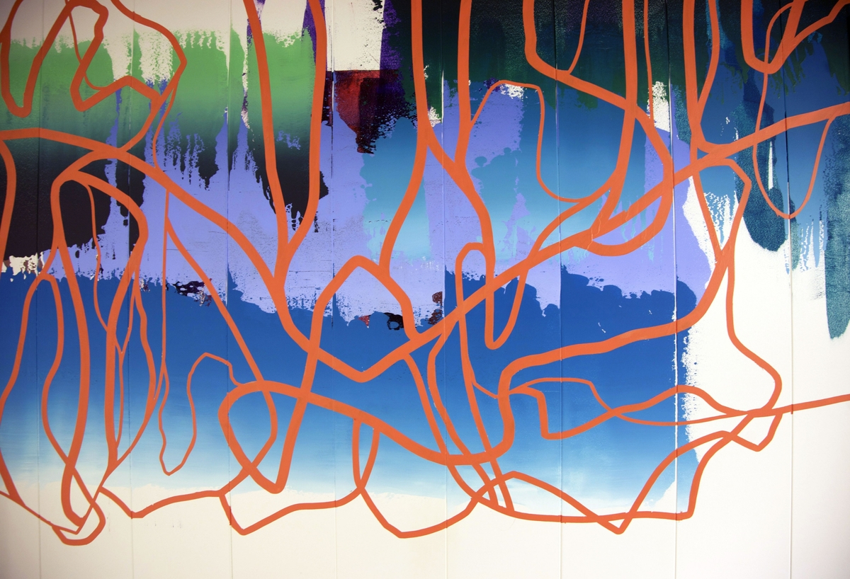 Akrylmaling påført med sparkel-spatel, sjablong og tape