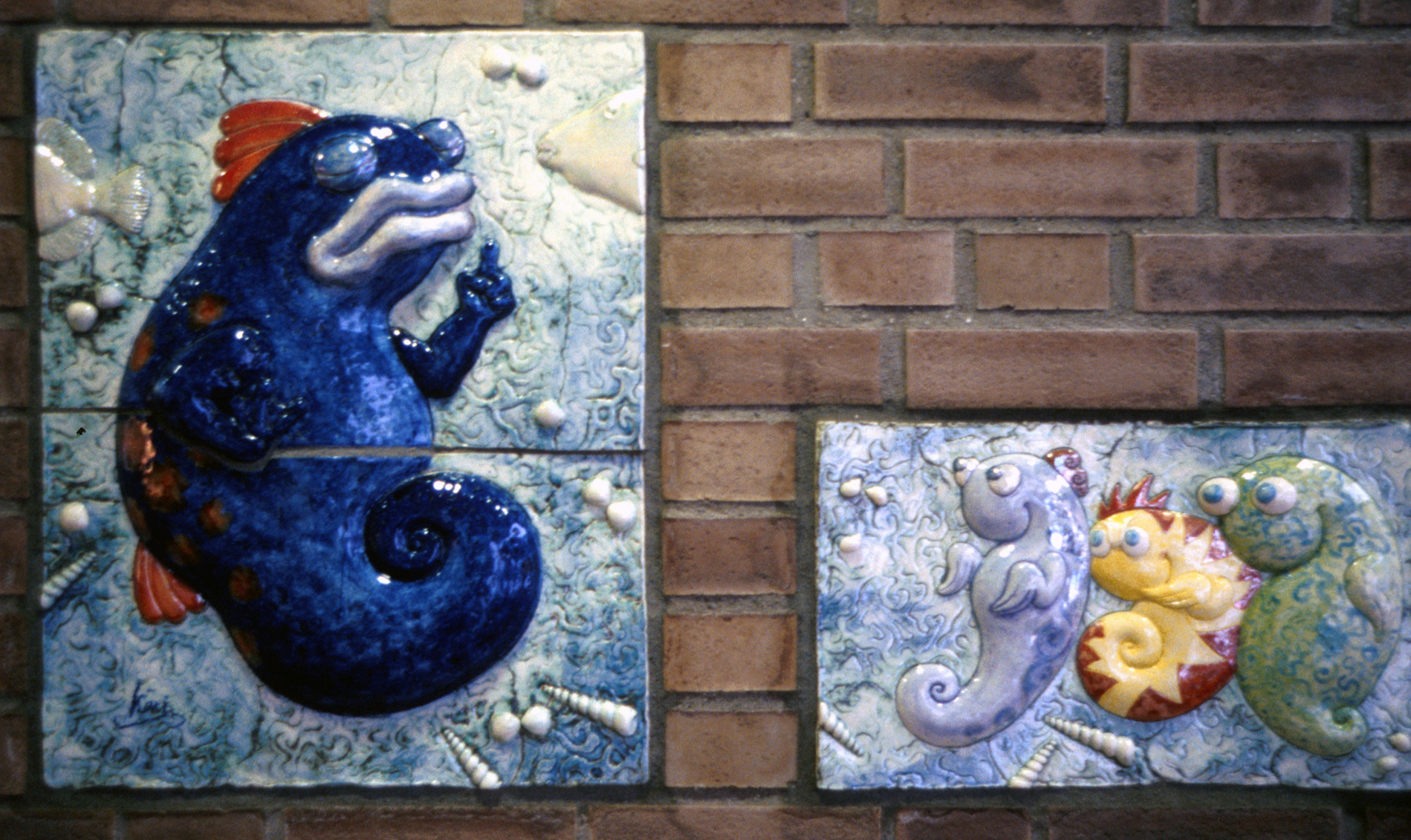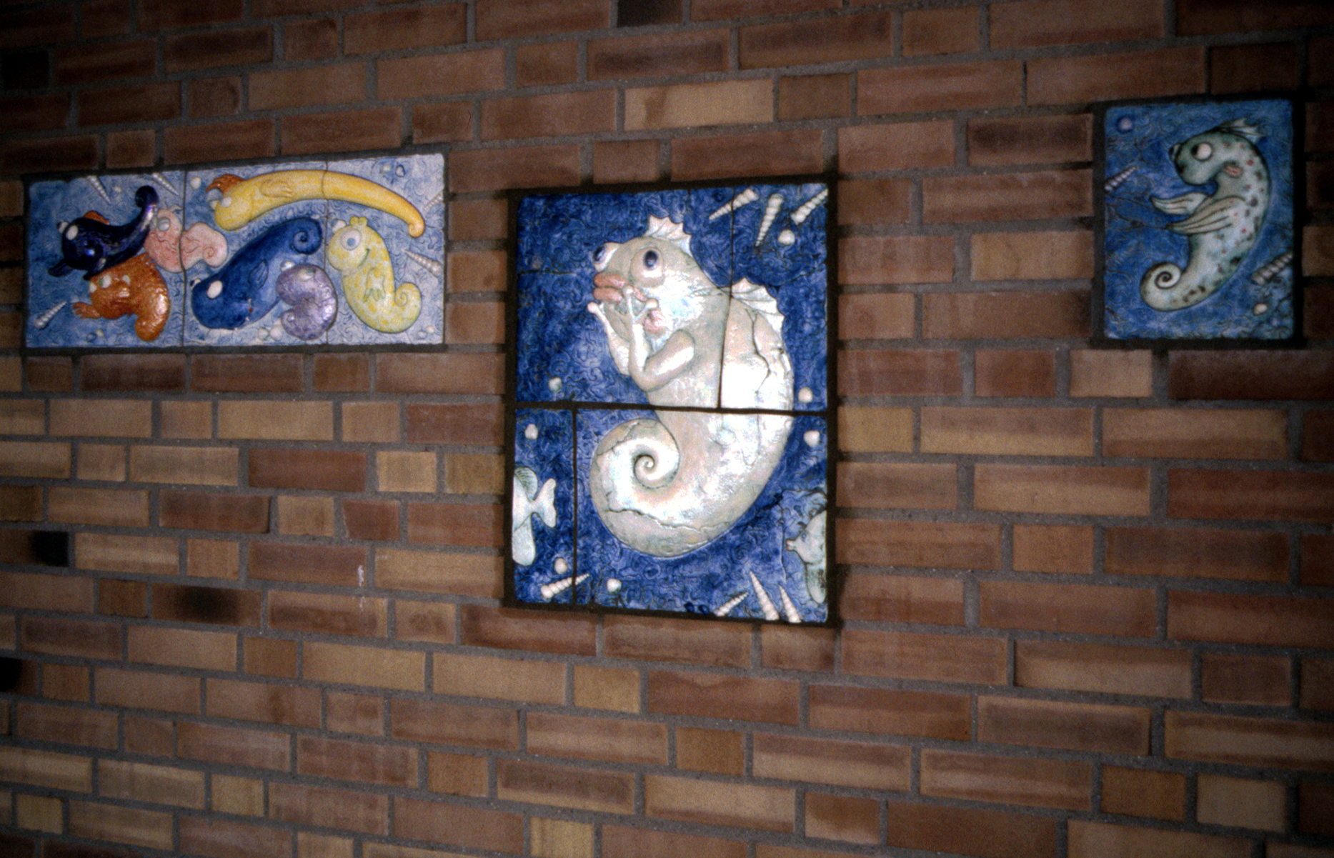 Utsmykkingen består av 6 keramiske relieffer som er integrert i veggen ved inngangspartiet.
