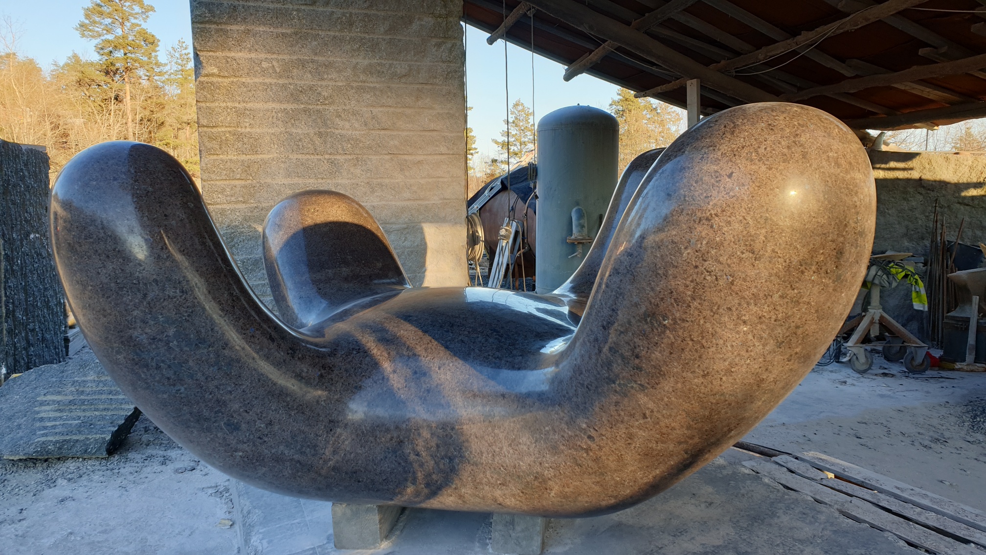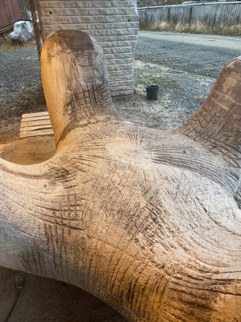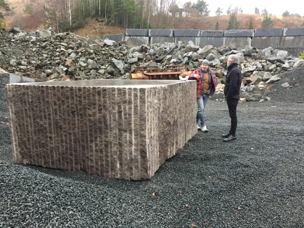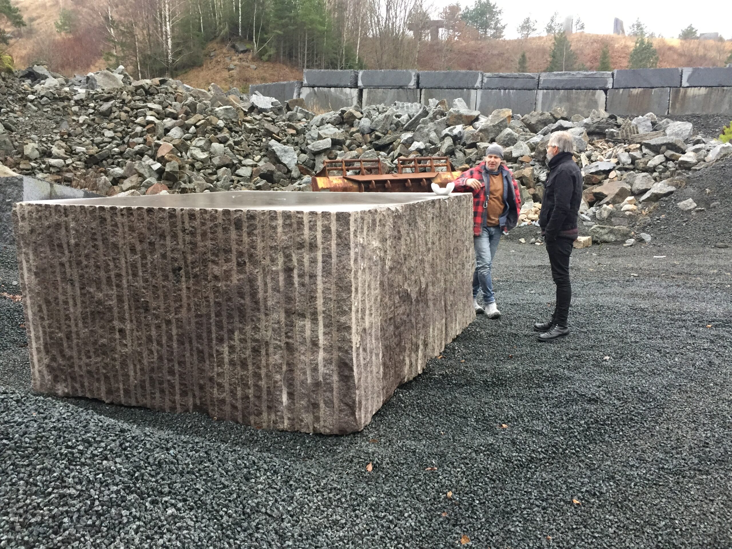 Skulpturen er i Rogalandsteinen anortositt, hentet fra et steinbrudd i Sirevåg utenfor Egersund. Arbeidet med steinen har vært en langsom og fysisk krevende prosess, forteller Bjarre.