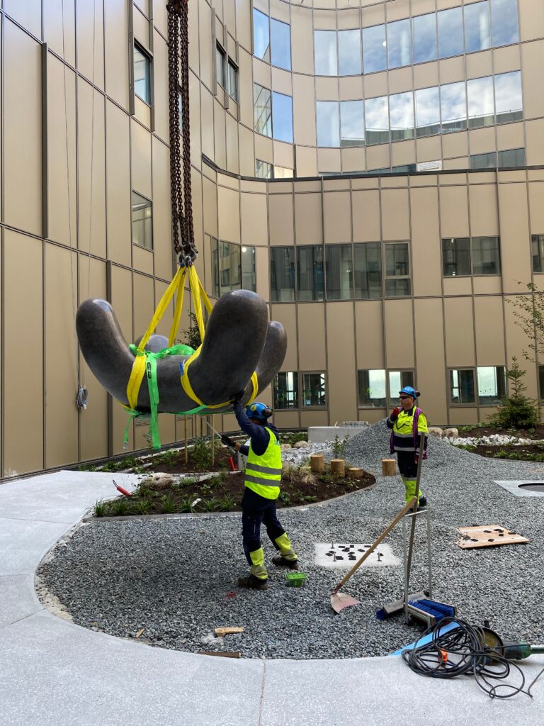 Det ble steinskulpturen Vesen, som er 1,5 meter høy, 2,4 meter bred og 2,8 meter lang og veier 4 tonn. Det måtte en stor heisekran til for å løfte den over bygningens tak og inn i det lukkede atriet. Begivenheten var så spektakulær at NRK Rogaland dekket det på nyhetene. Også Stavanger Aftenblad var til stede og skrev om verket. Dette skjedde allerede i september 2022, men det er først nå den blir tilgjengelig for publikum.