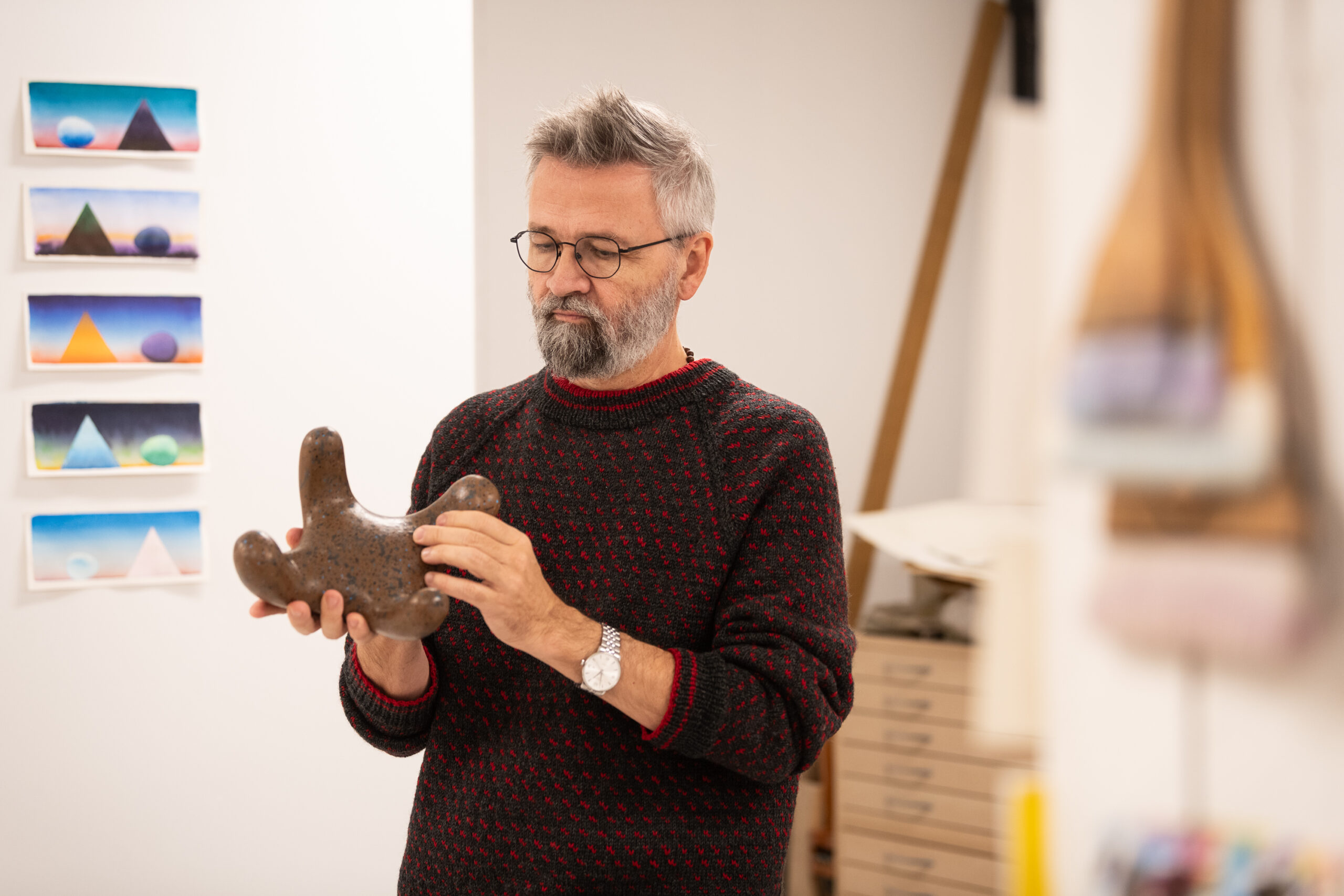 Bjarre viser noen skisser til de verkene som nå henger på Ullandhaug. Gjennomgående er motivene en pyramide-form og en egg-form som ligger i et slags abstrakt landskap.