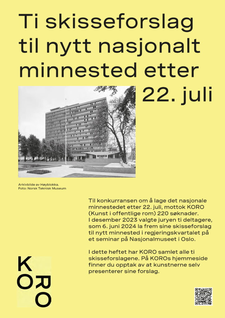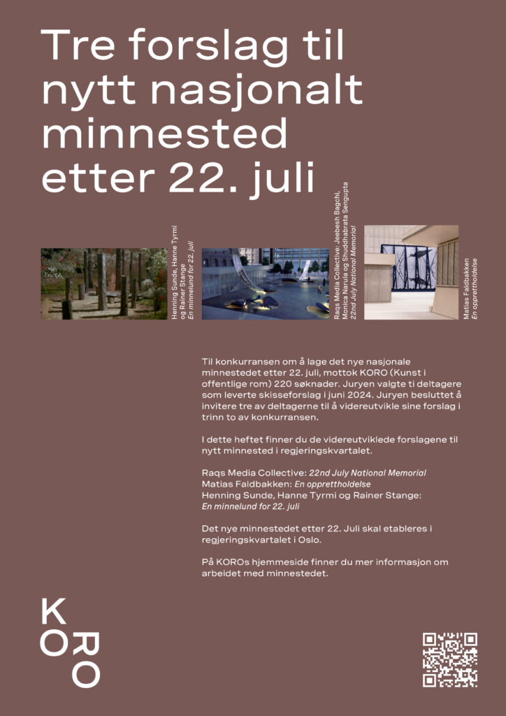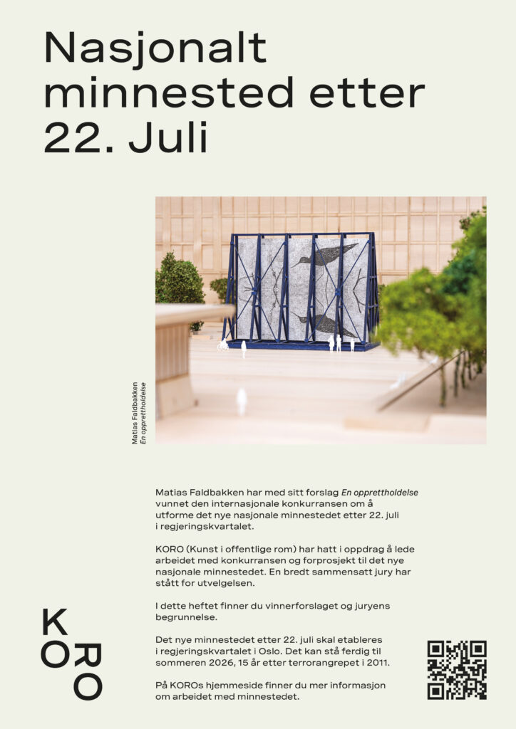 I 2012 bestemte regjeringen at det skulle etableres offisielle minnesteder i Hole kommune og regjeringskvartalet, som hedret de døde, overlevende, hjelpemannskaper og frivillige etter angrepene. Et midlertidig minnested ble åpnet i regjeringskvartalet i 2018. Minnestedet ved Utøyakaia i Hole kommune ble ferdigstilt våren 2022. I mai 2022 fikk KORO i oppdrag å lede arbeidet med konkurransen og forprosjekt til det nye nasjonale minnestedet. Etter en åpen prekvalifisering og en grundig konkurranse i to trinn, besluttet en tverrfaglig jury at kunstner Matias Faldbakkens forslag En opprettholdelse skal bli det nasjonale minnestedet etter 22. juli i regjeringskvartalet.