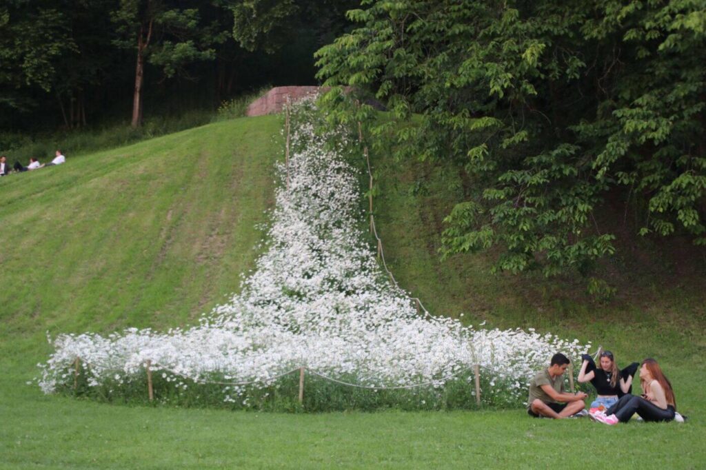 – I den bratte skråninga opp frå grasplenen på Ola Narr låg ein av dei 350 hoppbakkane i Oslo i gamle dagar. I dag er det ikkje lenger nok snø til at hoppbakkane kan brukast, og talet på hoppbakkar i Oslo er redusert til tre. Til minne om historia, og som ei konkret påminning om dei menneskeskapte klimaendringane med mildare vintrar, har Sandnes laga eit blomsterbed med kvite lokale blomar der unnarennet låg. Det er eit uventa og vakkert inngrep i lokalmiljøet som vekker nysgjerrigheit.