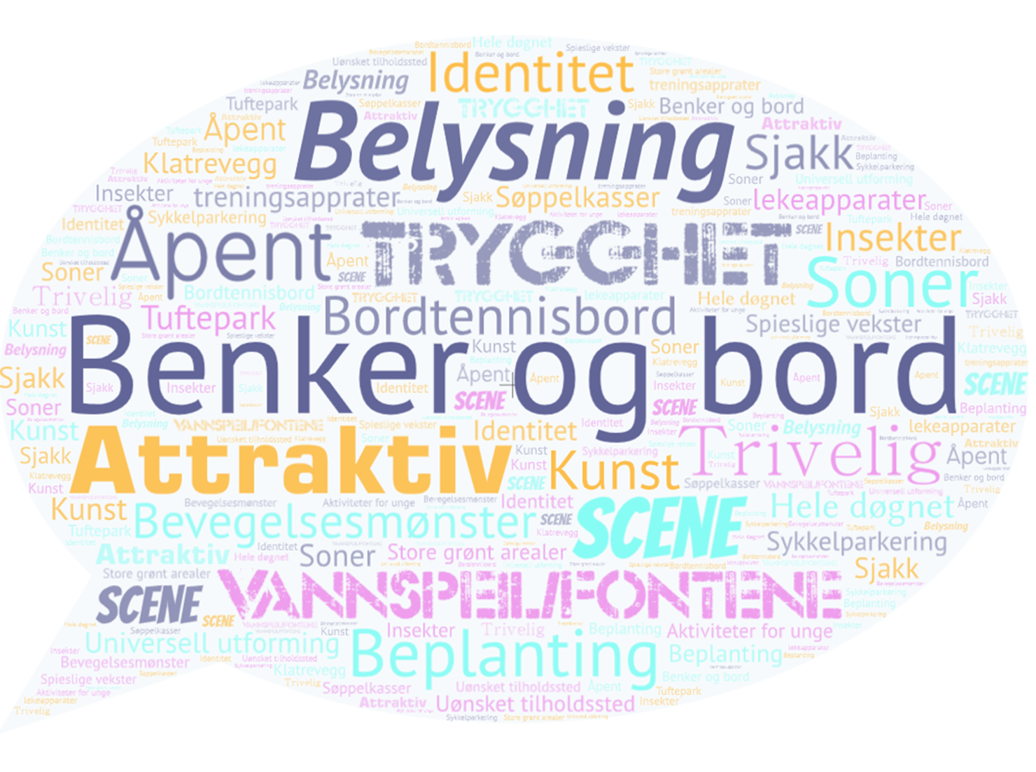 Elevene var ganske samstemte i at parken gjerne kan være fargerik og eventyrlig, romantisk ble nevnt, og mange snakket om at benker og inventar ikke skal være grå og geometrisk kjedelige, som så mye annet i byen.