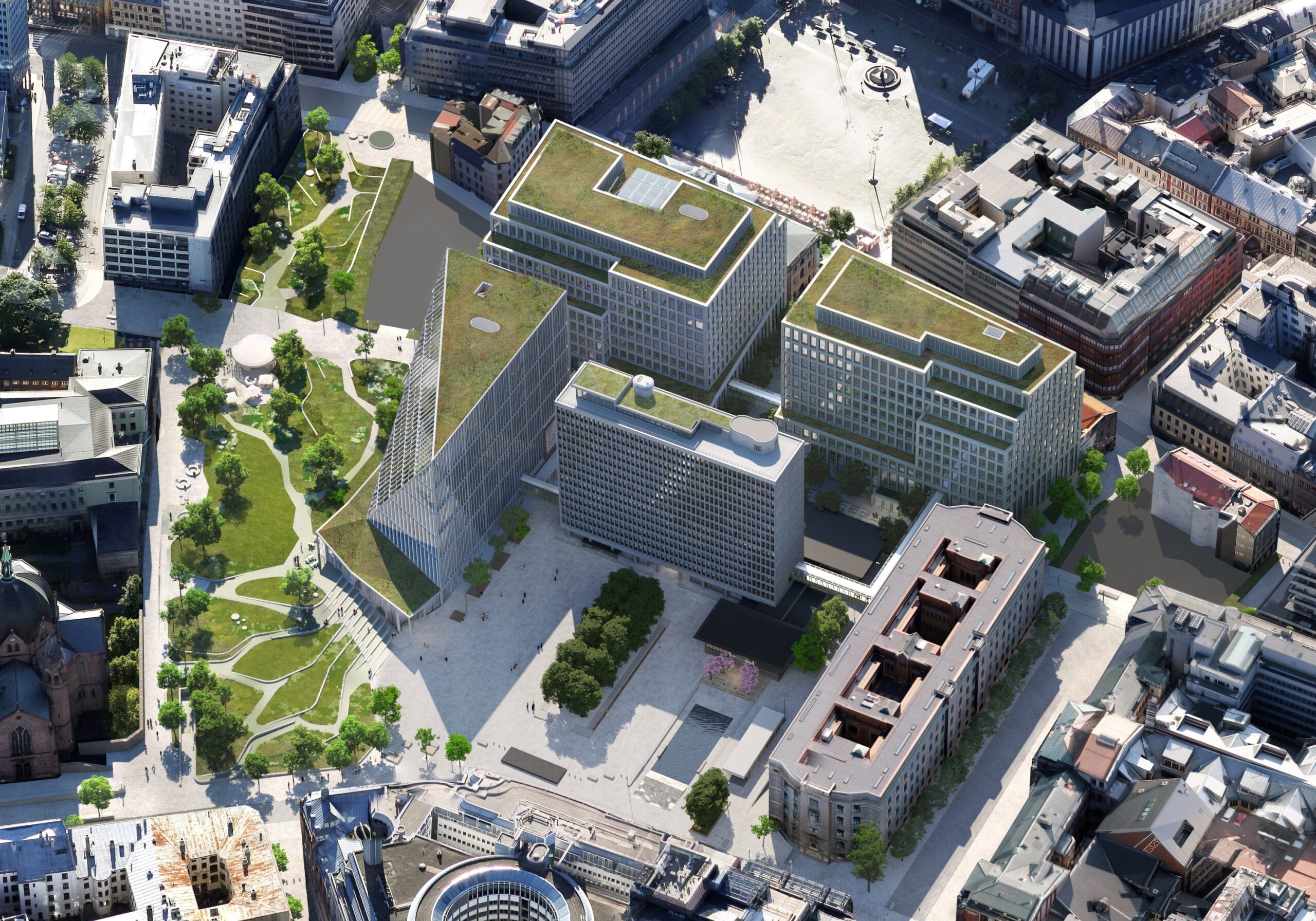 Byggetrinn 2 av det nye regjeringskvartalet – med den nye C-blokka (til høyre bak Høyblokka) og parken som skal anlegges mellom Akersgata og Møllergata. Illustrasjon: Statsbygg / Team Urbis / Nordic Office of Architecture​