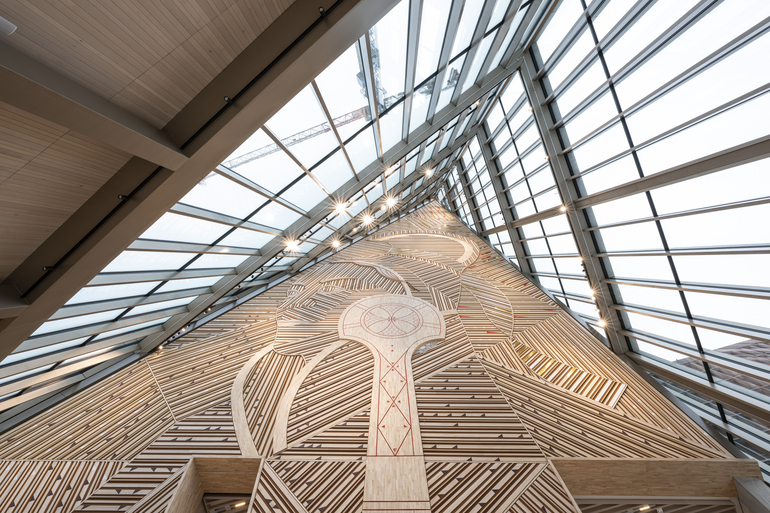 Outi Pieski, AAhkA (2025) befinner seg inne i A-blokkas inngangsparti, men kan også ses utenfra. Vi vil derfor også snakke om dette verket under omvisningen. AAhkA er et portrett av en samisk kvinne, og verket har en rekke referanser til duodji, tradisjoner, historie og kultur fra hele Sápmi. Verket er over 700 kvadratmeter stort og 51 meter høyt.