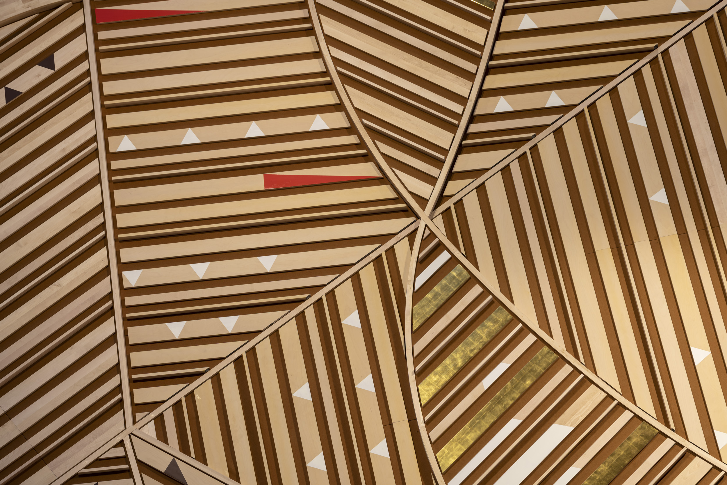 Sámi-Finnish artist Outi Pieski’s monumental artwork for the A-block of the new Government Quarter is based on Sámi history, culture and duodji (traditional Sámi handicrafts). The A-block may be considered a landmark building in the new Government Quarter, with the Pyramid Room as a central indoor space. The artwork is integrated into the entire surface of the slanted wall in the room, which has an area of over 700 m2, and a height of 51 metres. This is based on the composition of the architecture’s rib wall. The monumental wooden surface will be an assemblage of colours, materials and traditional handicrafts. Pieski’s sketch shows a half-profile figure wearing a ládjogahpir, or “The Foremothers’ Hat of Pride”, on its head and brass rings on its fingers. The figure holds a staff bearing Northern Sámi patterns and traditional Southern Sámi wood carvings and designs. Both the hat, rings and staff are associated with duodji.