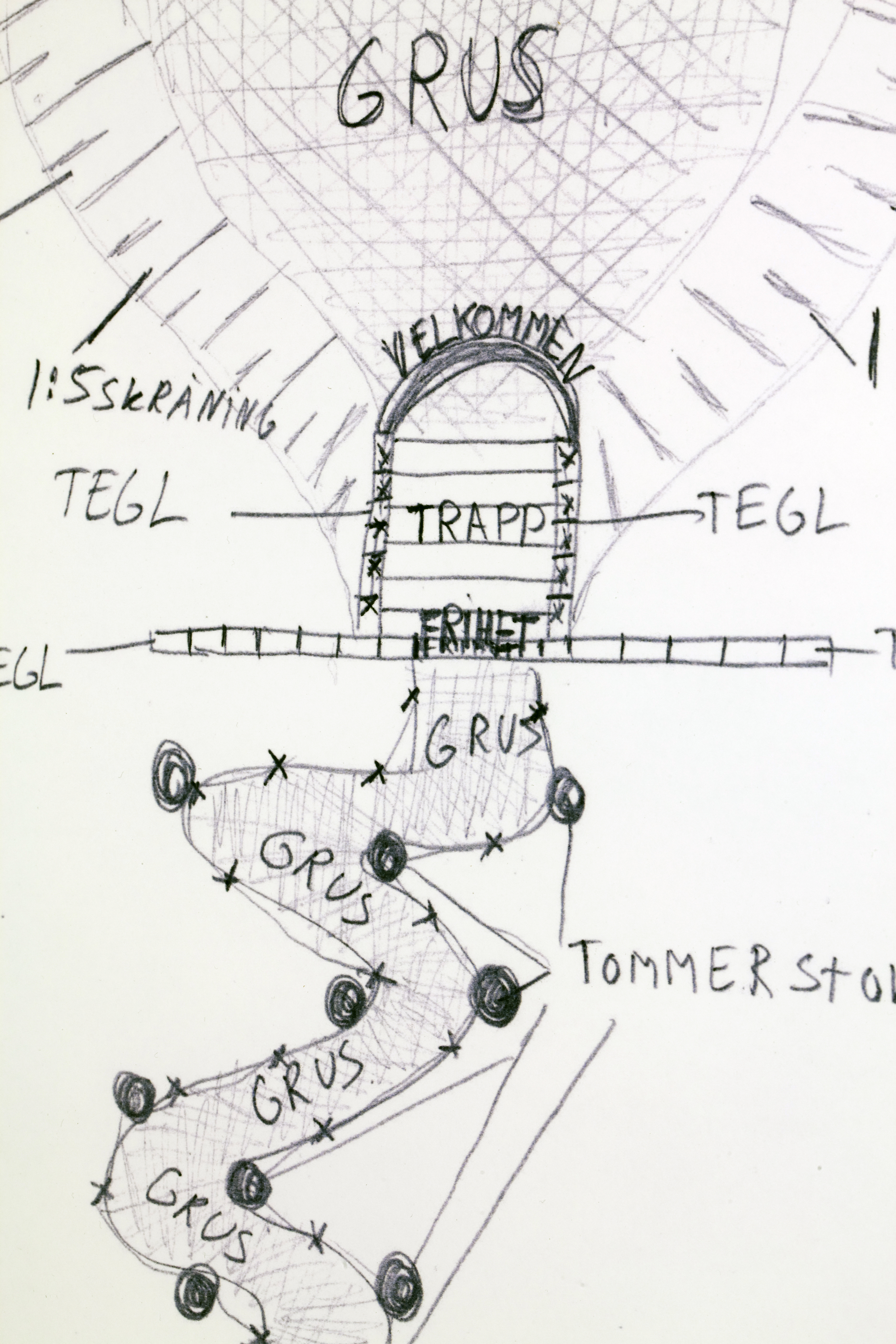 I 2013 ble én av skissene valgt ut og realisert. Med midler fra KOROs uteromsordning URO bygget de innsatte selv den tre meter høye smijernsporten, tegnet av fange nr. 847, i enden av en brosteinsti i fengselets uteområde. Les mer om dette her.