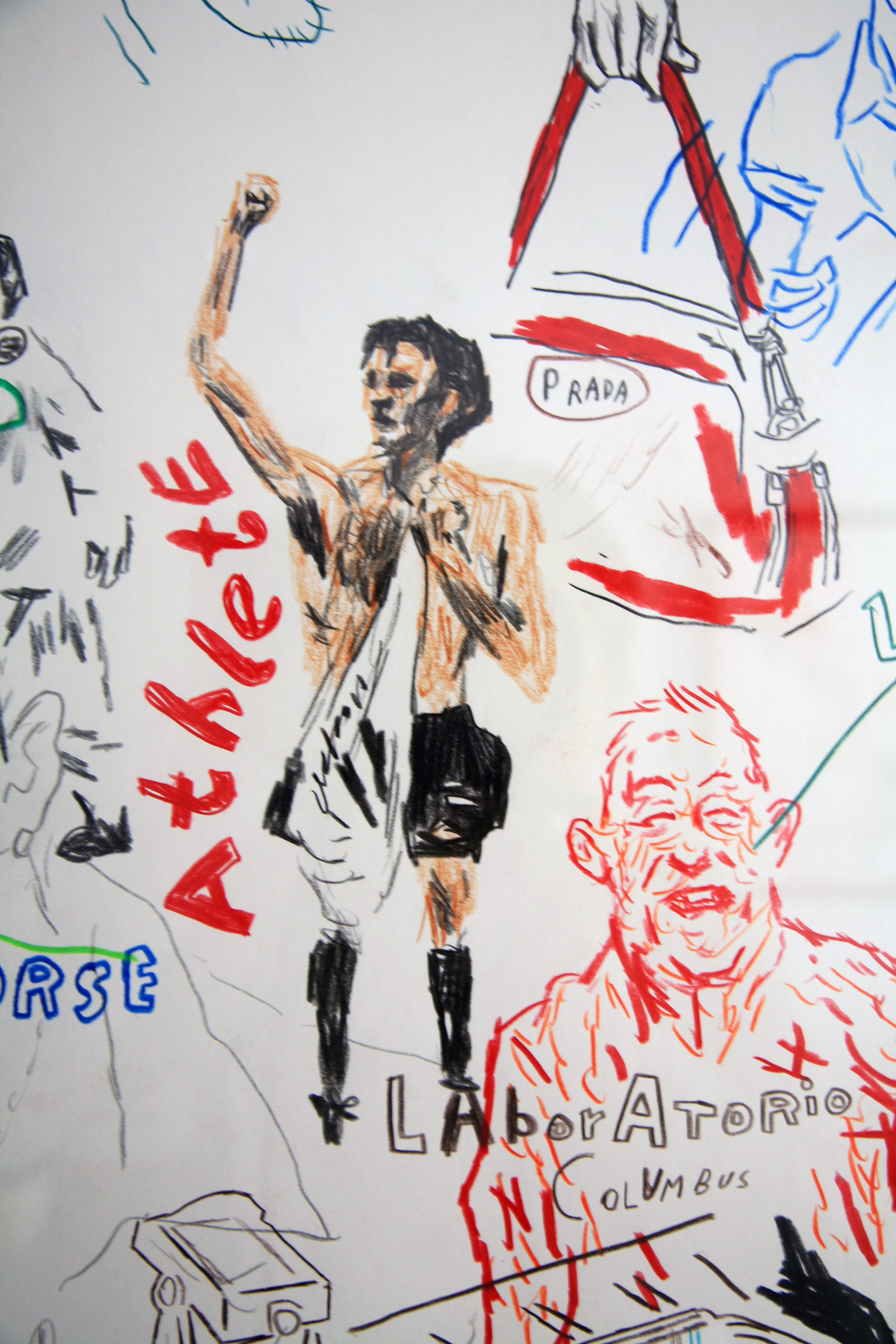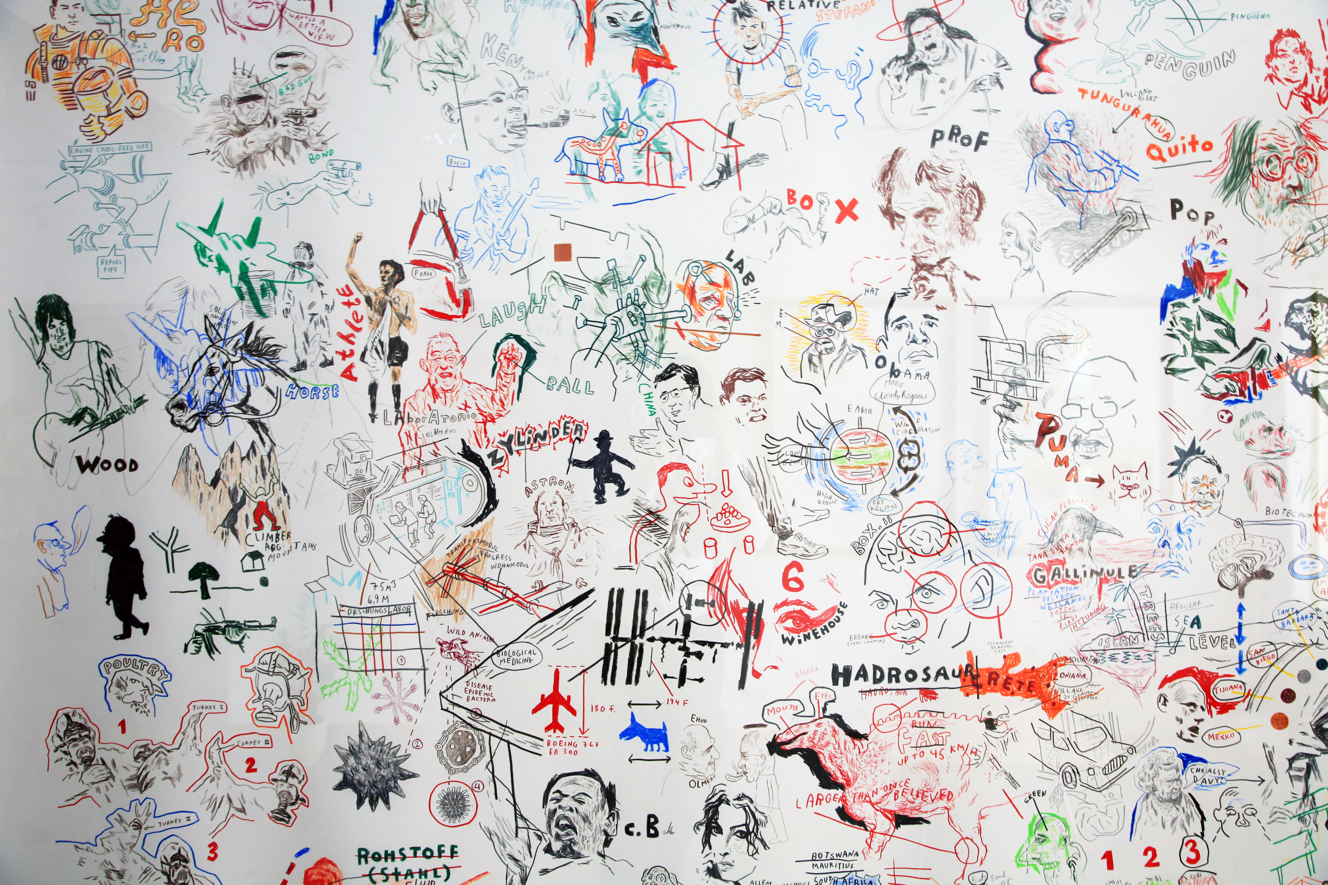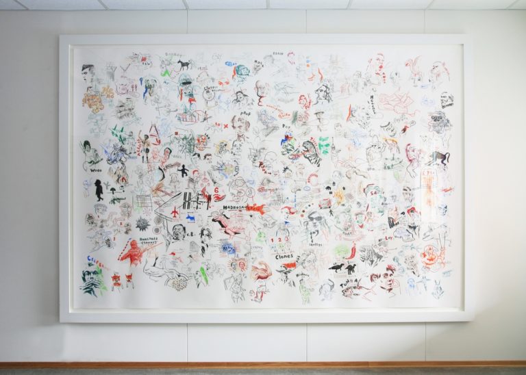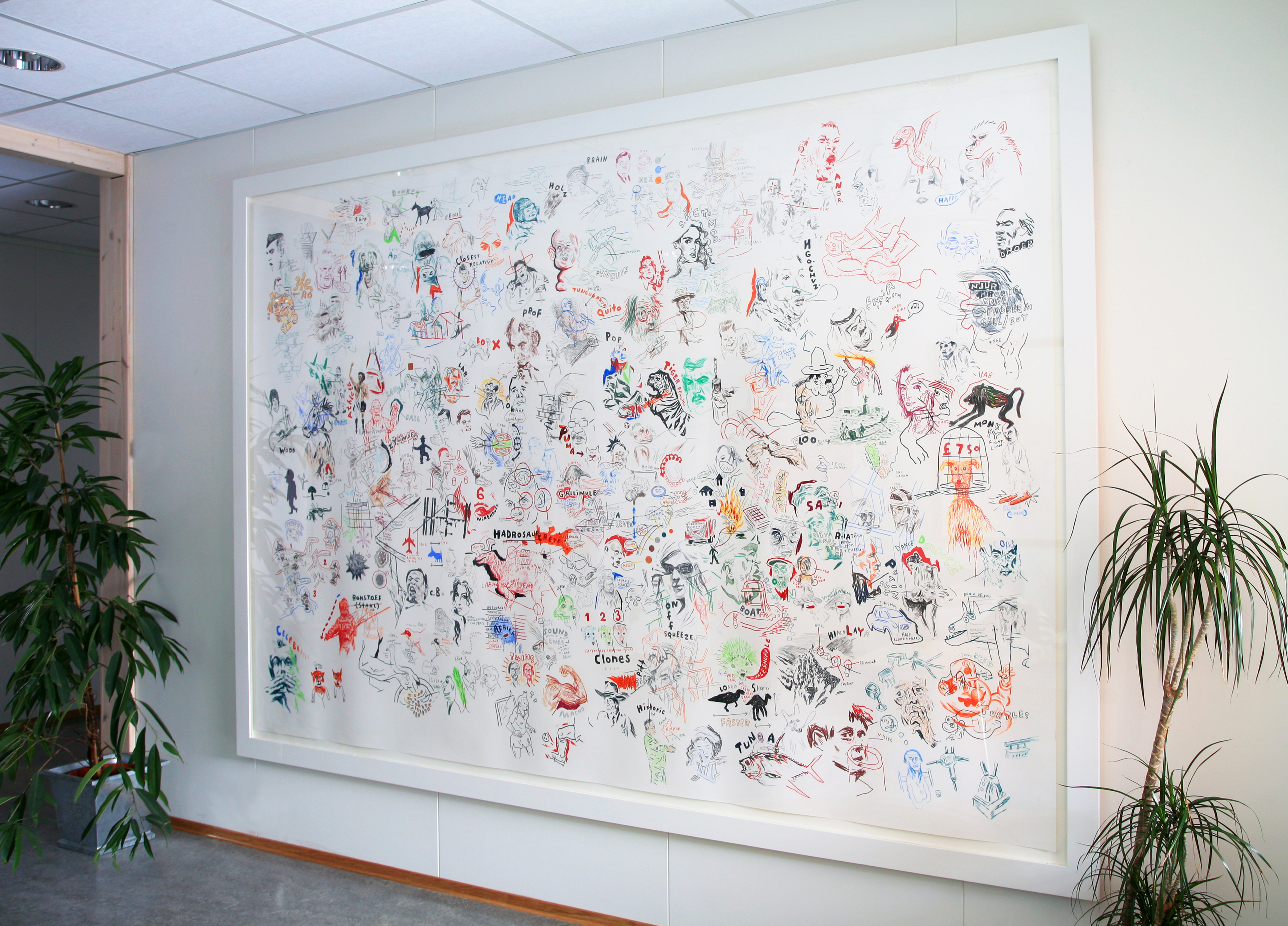 I inngangspartiet dekker Per Dybvig (f. 1964) hele rommets kortvegg med sitt rå, myldrende tegneark. På et 290 cm bredt papirark har Dybvig tatt utgangspunkt i dokumentarisk nyhetsmateriale fra perioden november–desember 2007. Han har rablet fabulerende, fartsfylte skisser med bruk av blyant og fargeblyant i et sinnrikt, detaljert mønster. Tegningen sender tankene til massemedienes bildeflimmer og informasjonsstrøm, der vi hele tida utsettes for en strøm av meninger og tanker som overvelder og filtrerer seg inn i hverandre.