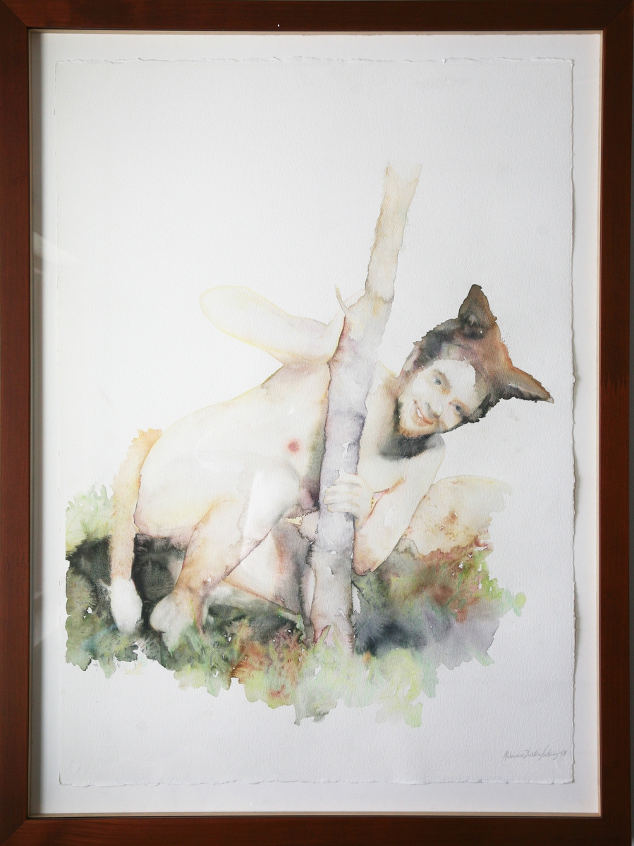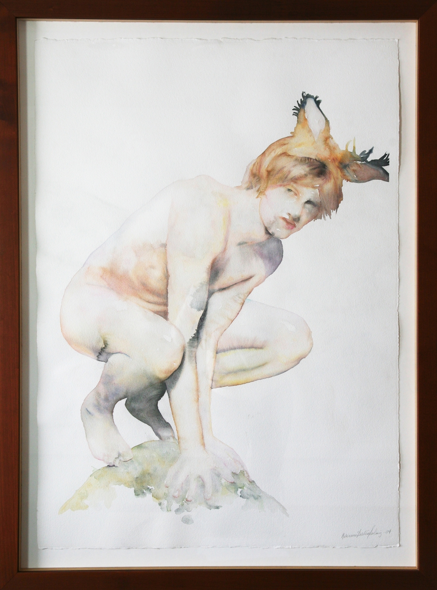 Hos Marianne Darlén Solhaugsstrands to innkjøpte verk finner vi et roligere, mer drømmende og poetisk uttrykk. I tillegg til tegning arbeider Solhaugstrand også med akvarell, og anvender en realitetstro teknikk som enkelte steder legger seg tett opp mot det fotografiske. Samtidig er motivene lekne og fantasifulle: Tegningene framstiller to menn med dyreører og dyrehale, som poserer lekent med dyrisk naturlighet og en vakker, ungdommelig styrke.