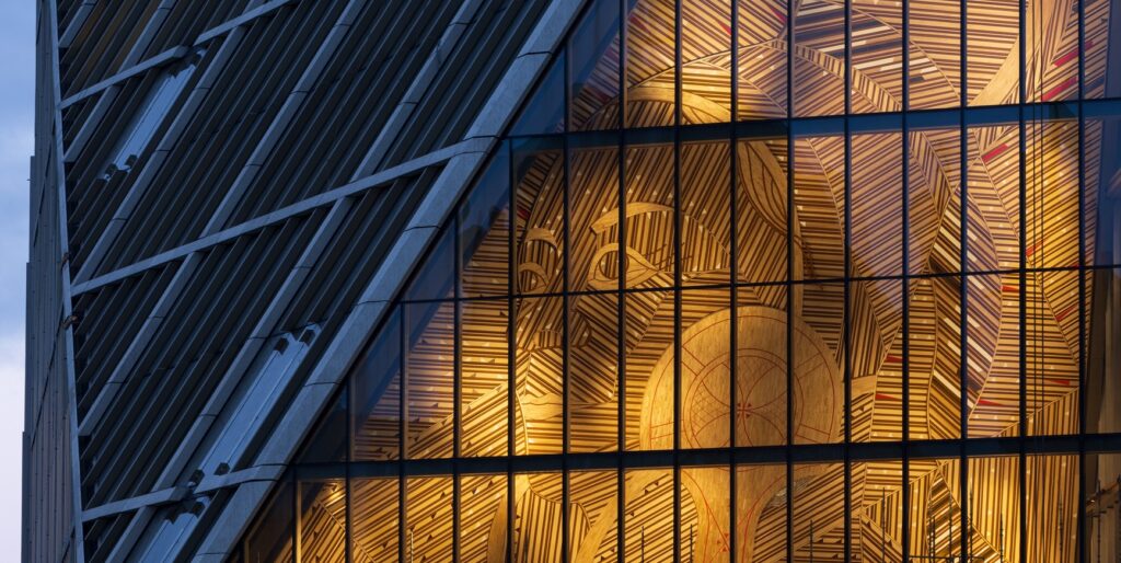 Outi Pieski har laget verket AAhkA, som vil møte ansatte og besøkende i den nye A-blokka. Verket er installert, og er nå godt synlig fra Akersgata.